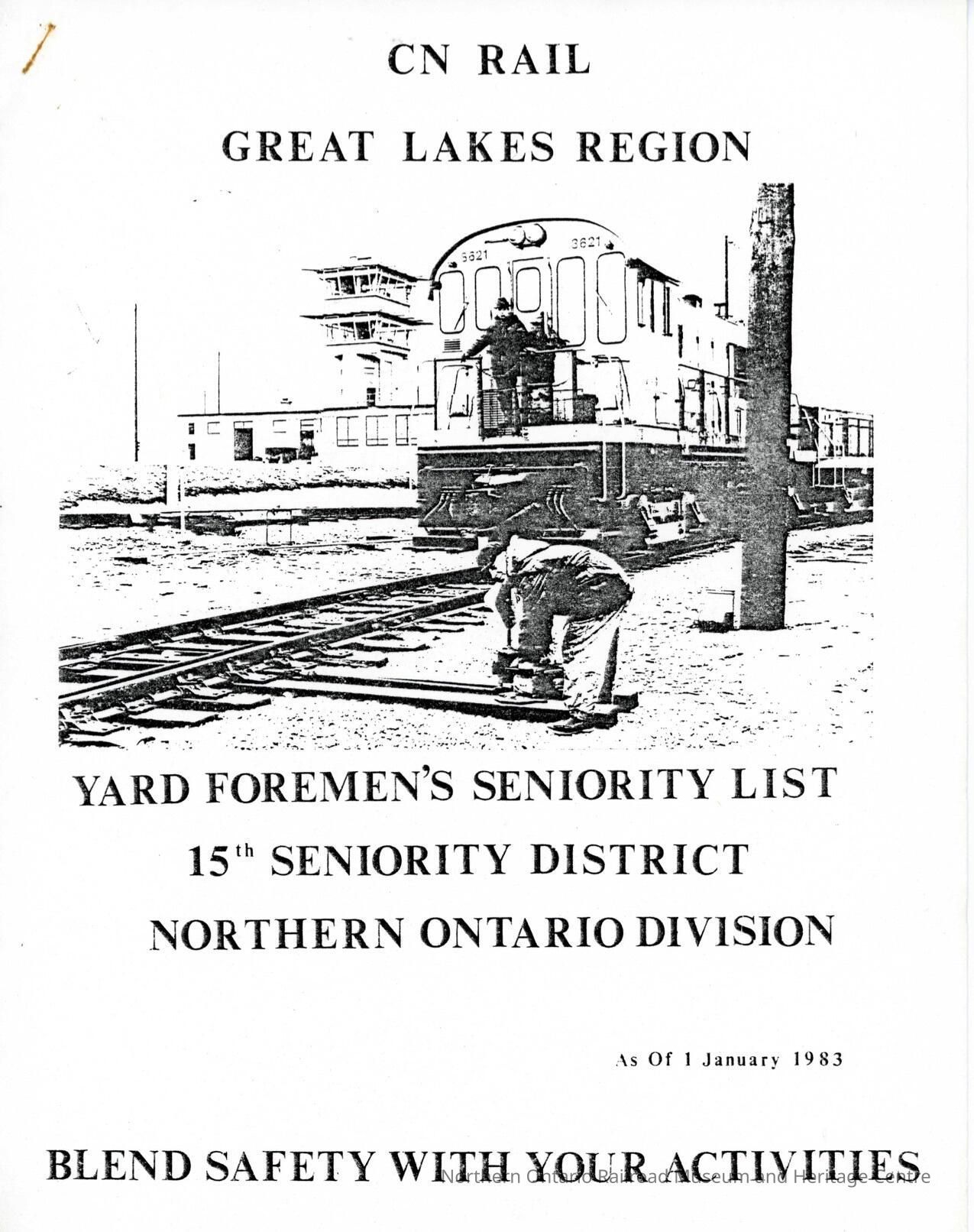 CN Rail, Great Lakes Region, Yard Foremen's Seniority List, 15th Seniority District, Northern Ontario Division, 1 January 1983.Collection