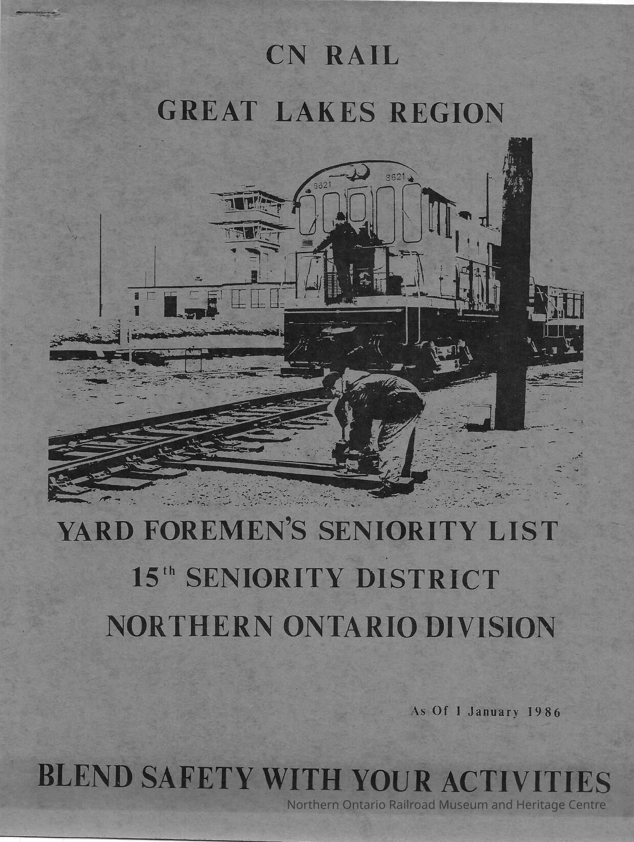 CN Rail, Great Lakes Region, Yard Foremen's Seniority List, 15th Seniority District, Northern Ontario Division, 1 January 1986.Collection