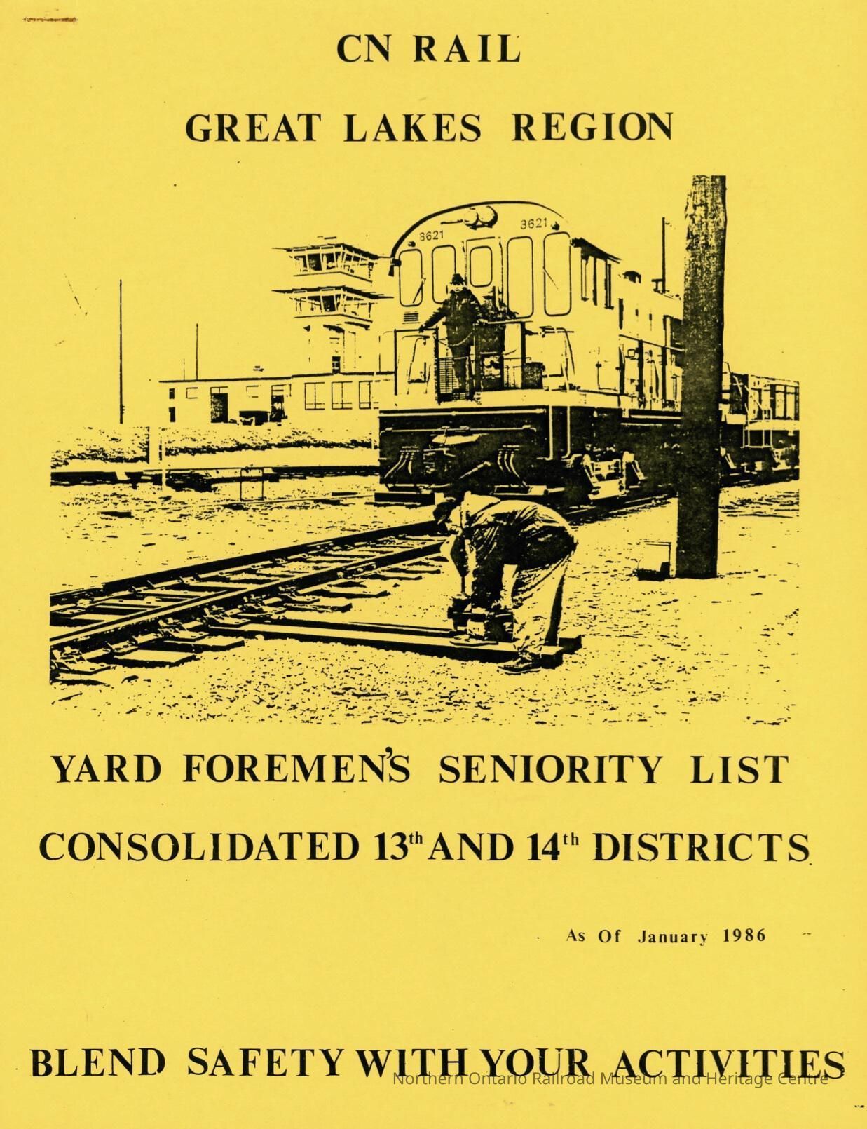 CN Rail, Great Lakes Region, Yard Foremen's Seniority List, Consolidated 13th and 14th Districts, as of January 1986.Collection