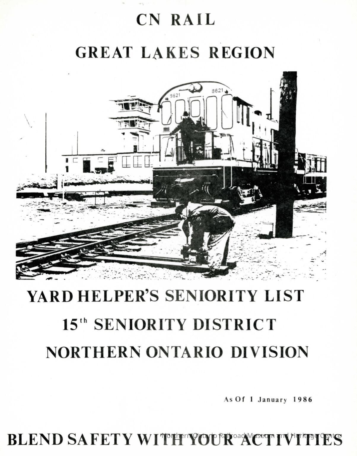 CN Rail, Great Lakes Region, Yard Helper's Seniority List, 15th Seniority Distirct, Northern Ontario Division, 1 January 1986.Collection