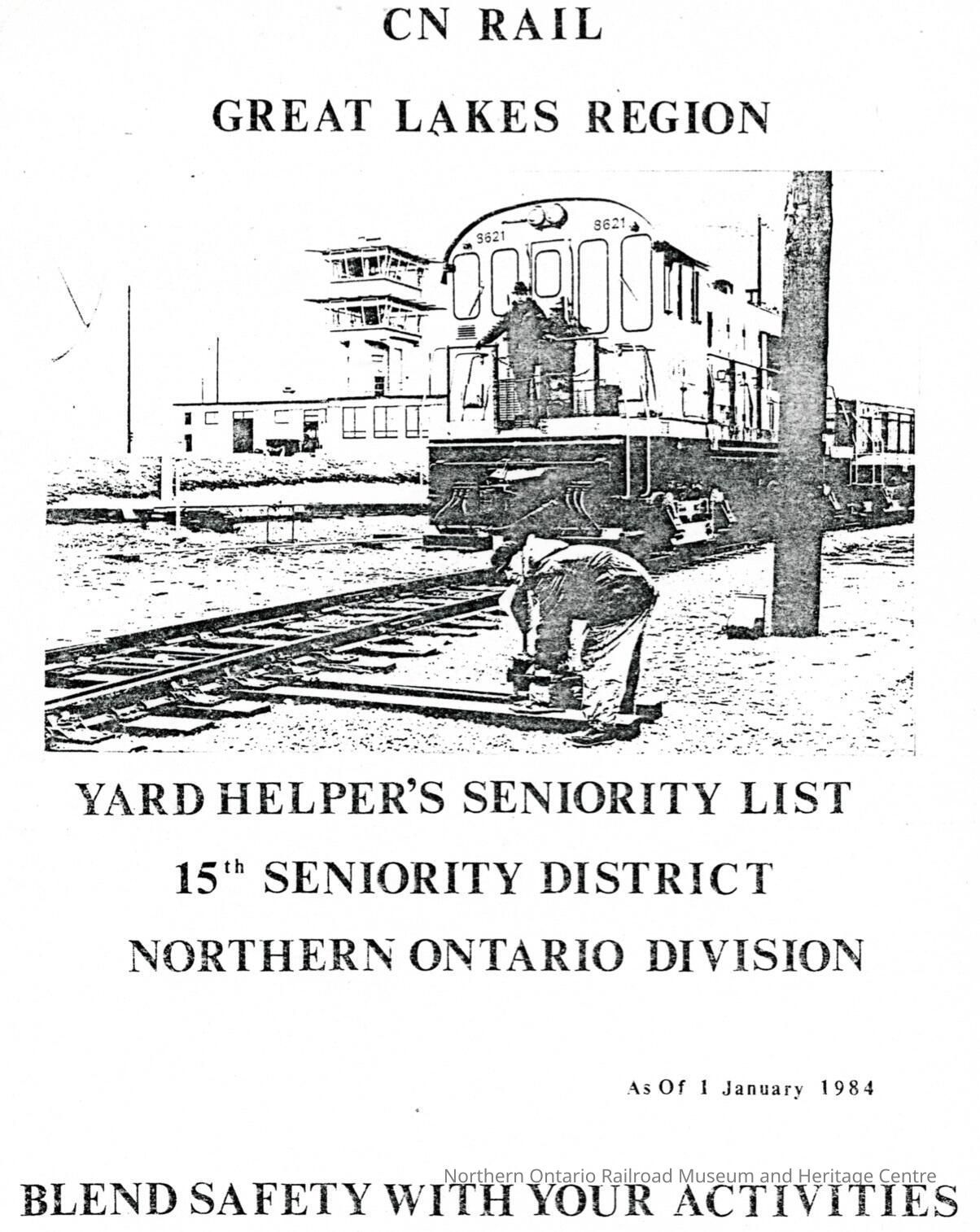 CN Rail, Great Lakes Region, Yard Helper's Seniority List, 15th Seniority District, Northern Ontario Division, 1 January 1984.Collection