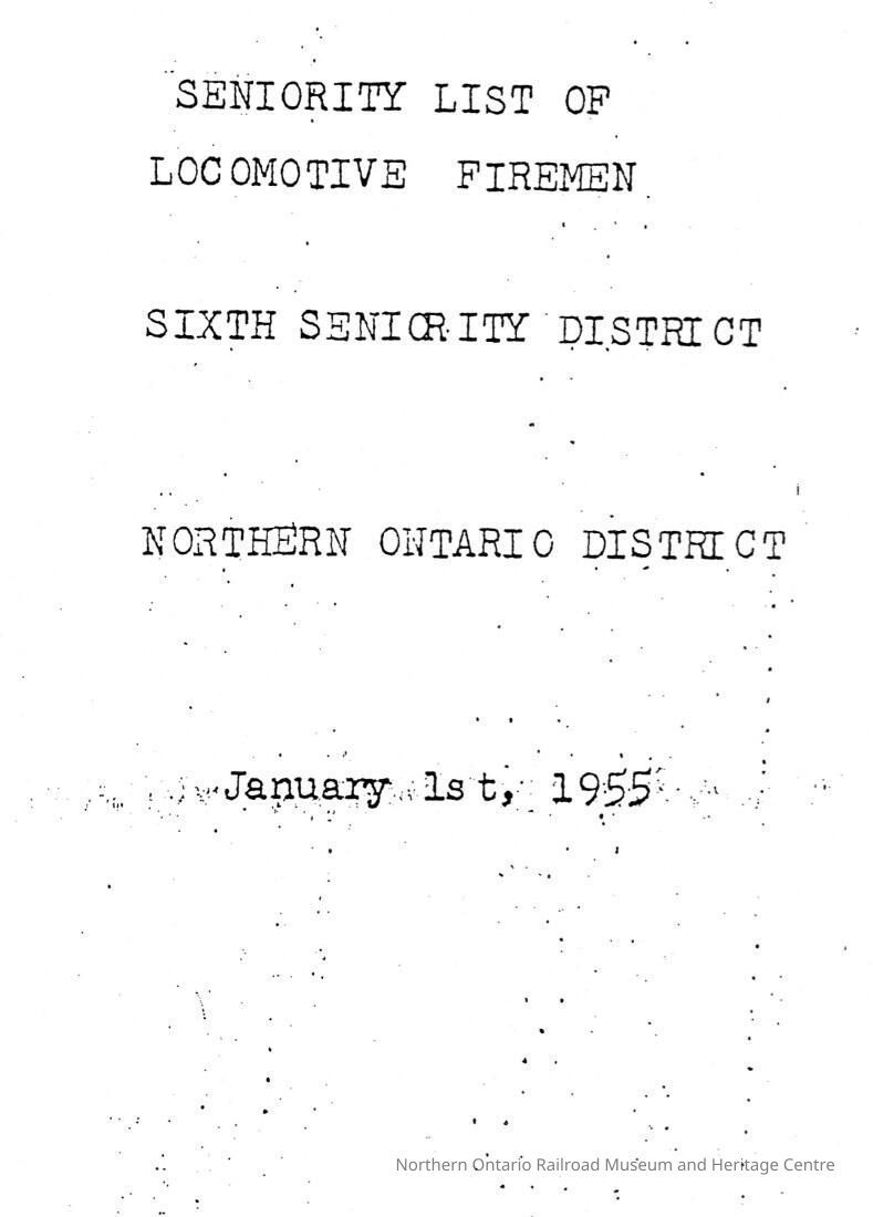 Seniority List of Locomotive Fireman, 6th Seniority District, Northern Ontario District, January 1, 1955.Collection