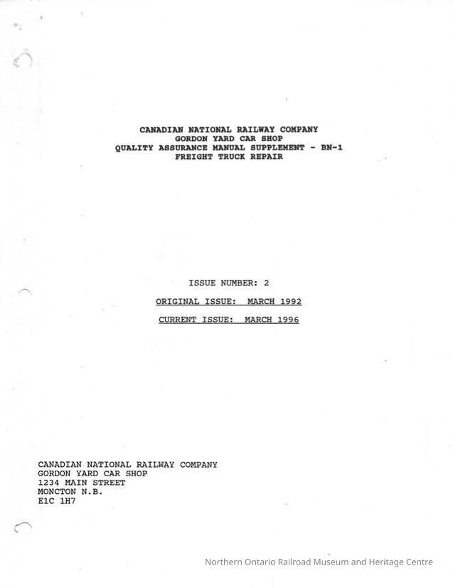 Canadian National Railway Company, Gordon Yard Car Shop, Quality Assurance Manual Supplement, BN-1 Freight Truck Repair, Issue Number 2, Original Issue March 1992, Curent Issue, March 1996Collection