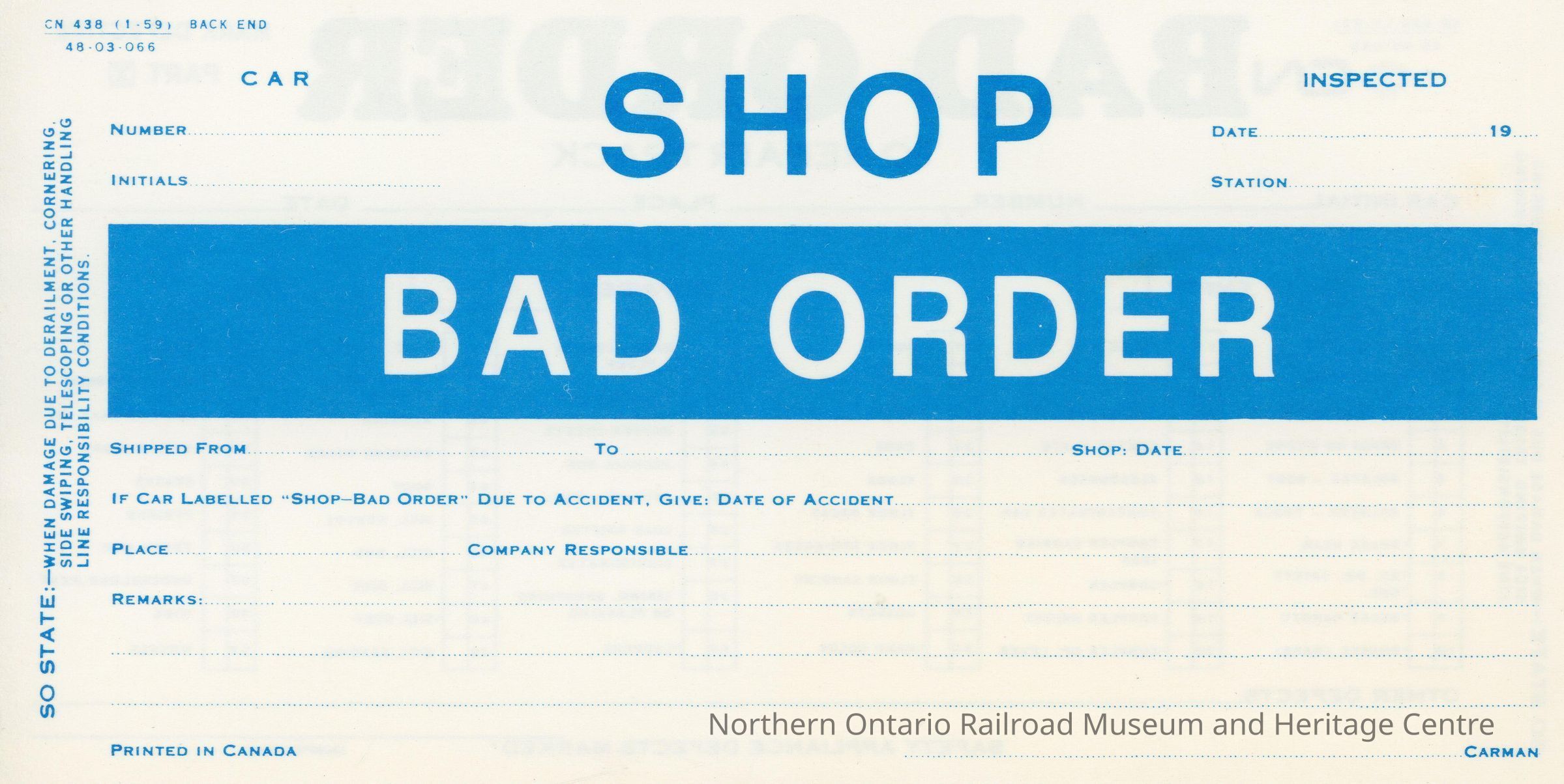 Form, Canadian National shop bad order form. The form is blank however it has the sections to record: Car number, initials, date, station, shipped from, sent to, date, date of accident if applicable, place of accident, company responsible for accident, remarks, carmen, to repair track, car initial, number, place, date, load, empty, time placed, time repaired, inspector signature, safety appliance defects marked by "x".