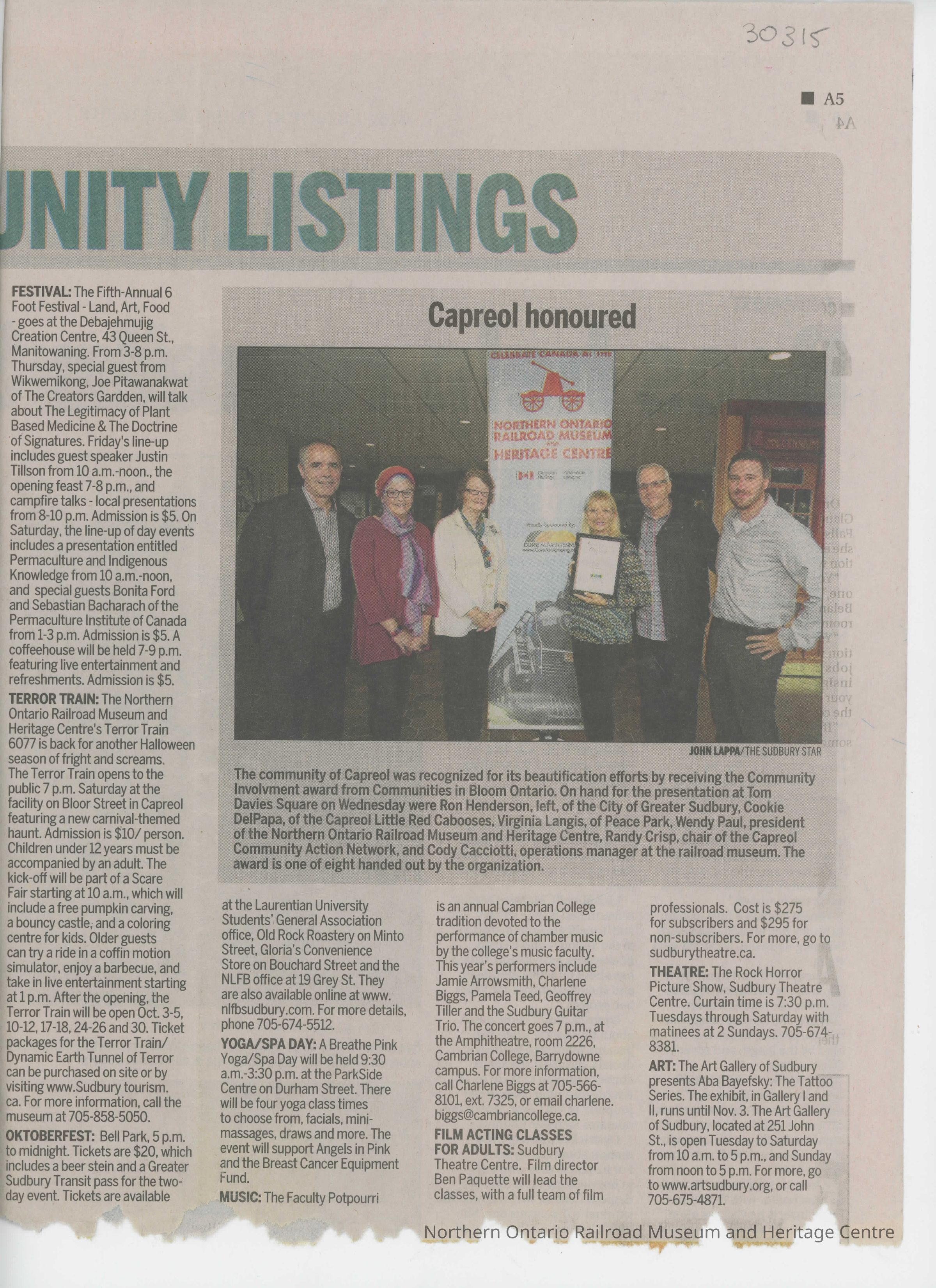 Community Listings for October 3, 2014 for the Sudbury Star, featuring the NORMHC Receiving the Community Involvement Award from communities in bloom, as well as the opening of the terror trainContext