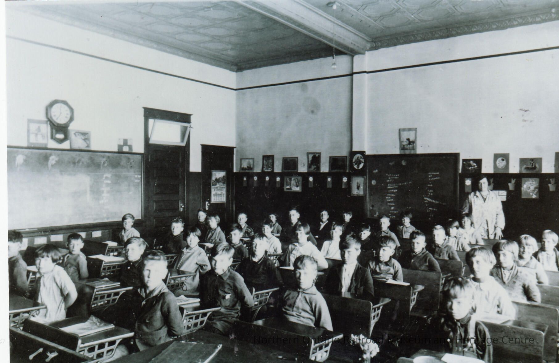 Black and white- Several children sit at their desk. Behind them is their teacher, and a chalkboard with writing on it.Collection