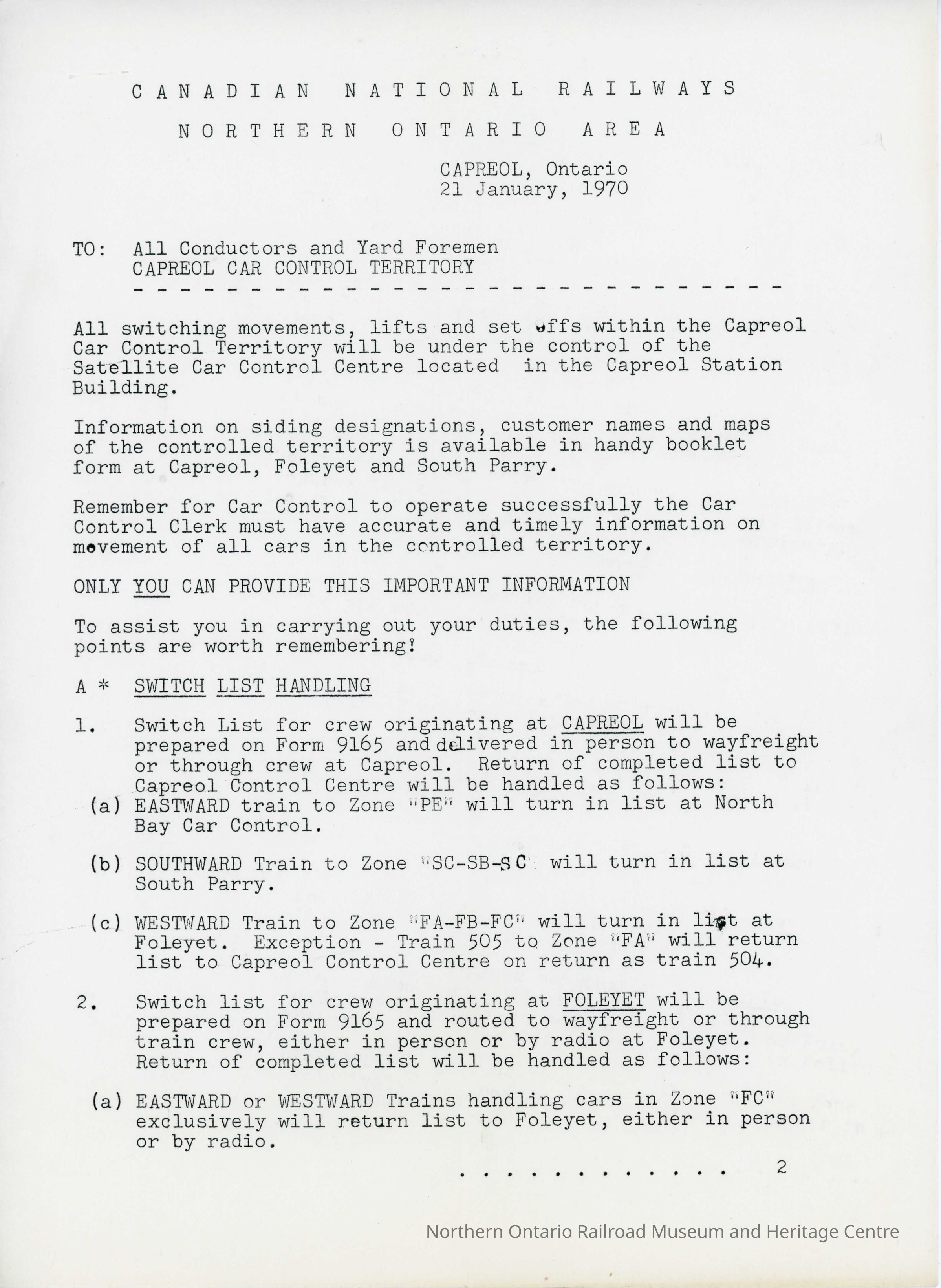 CN Northern Ontario Area ,21 Jan 1970, Bulletin to All conductors and Yard Foreman about CAPREOL CAR CONTROL TERRITORY. Outlines switch handling, foyleyet, switch lists etc.Collection