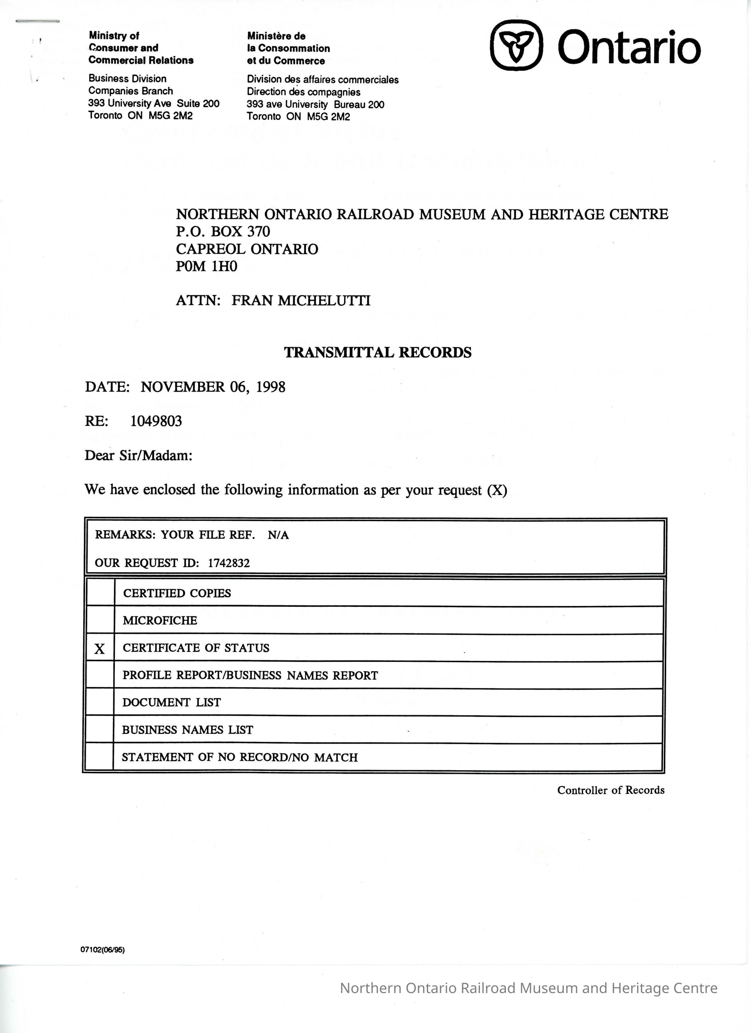 Province of Ontario Ministry of Consumer and Commercial RelationsPlace Published