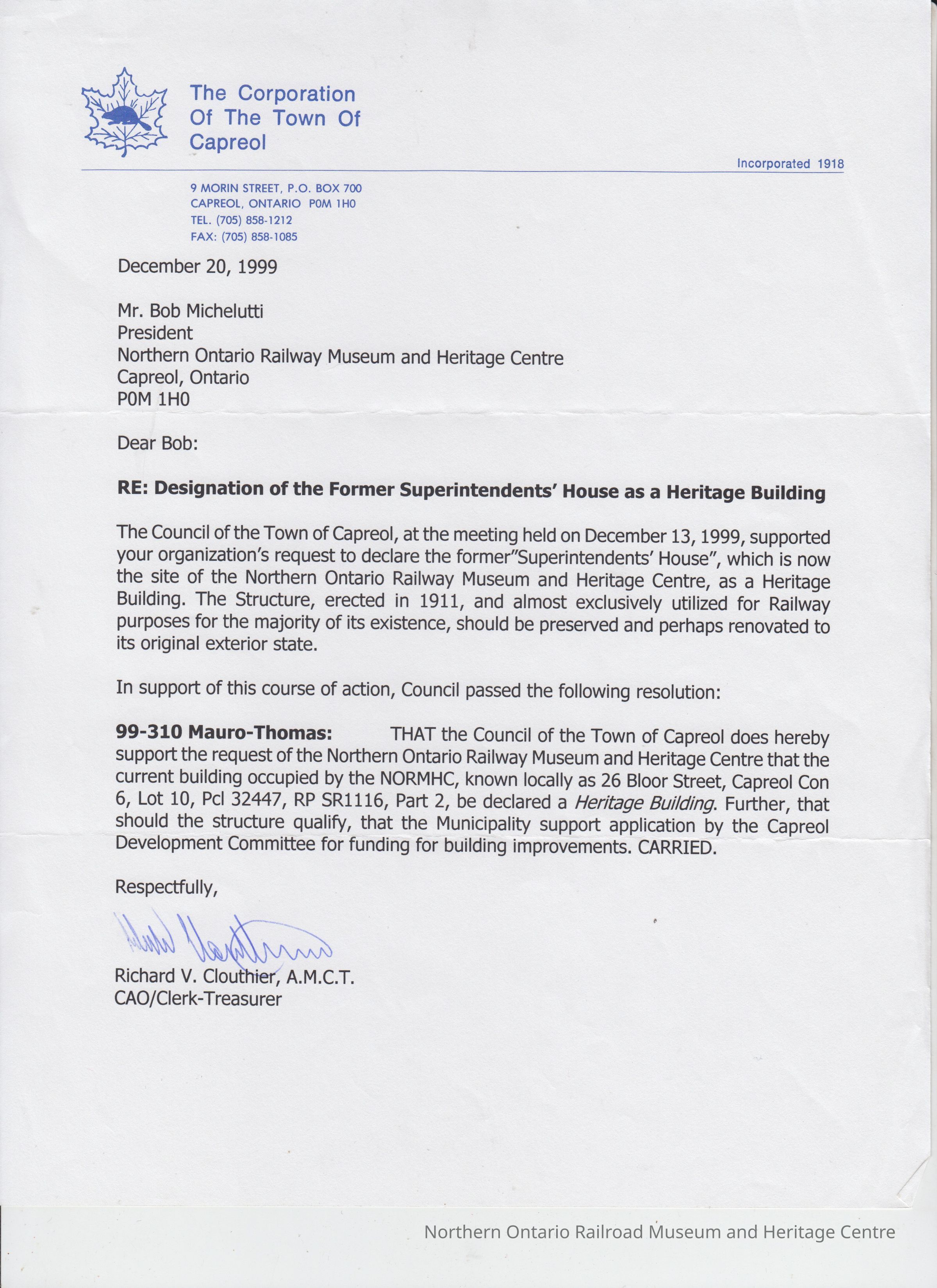 Corporation of Town of Capreol Letter to Bob Michelutti, RE: Designation of the Former Superintendents House as a Heritage BuildingDescription