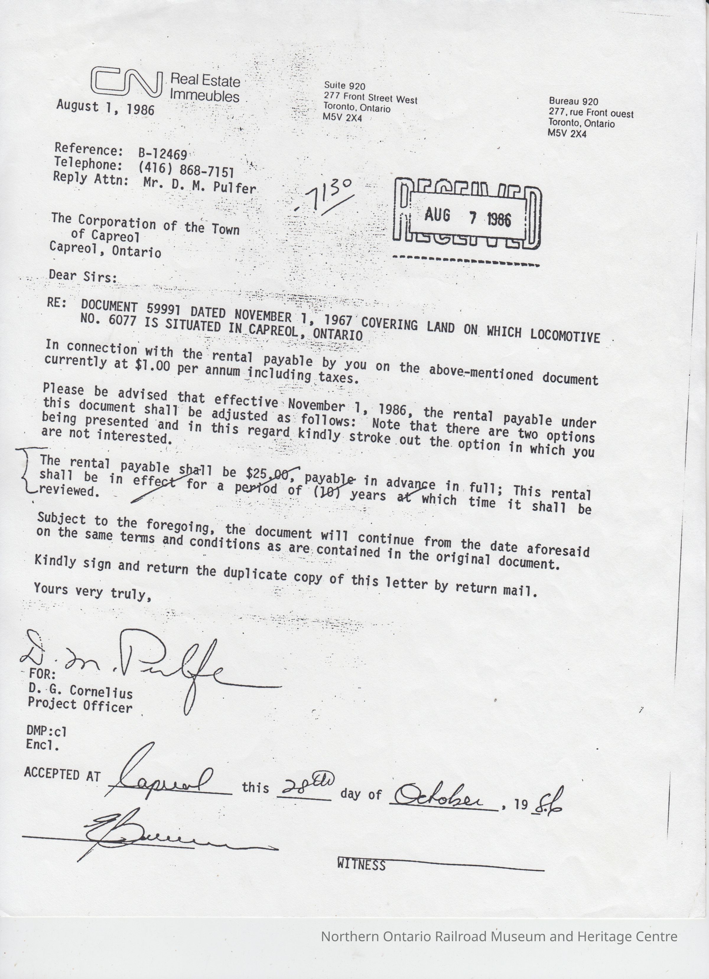 Letter from Cn Project Officer DG Cornelius to Town of Capreol, RE: Increase of NORMHC Land Lease Price. Details increase of Land Leas Price from $1.00 to $25.00 for a 10 year period.Collection