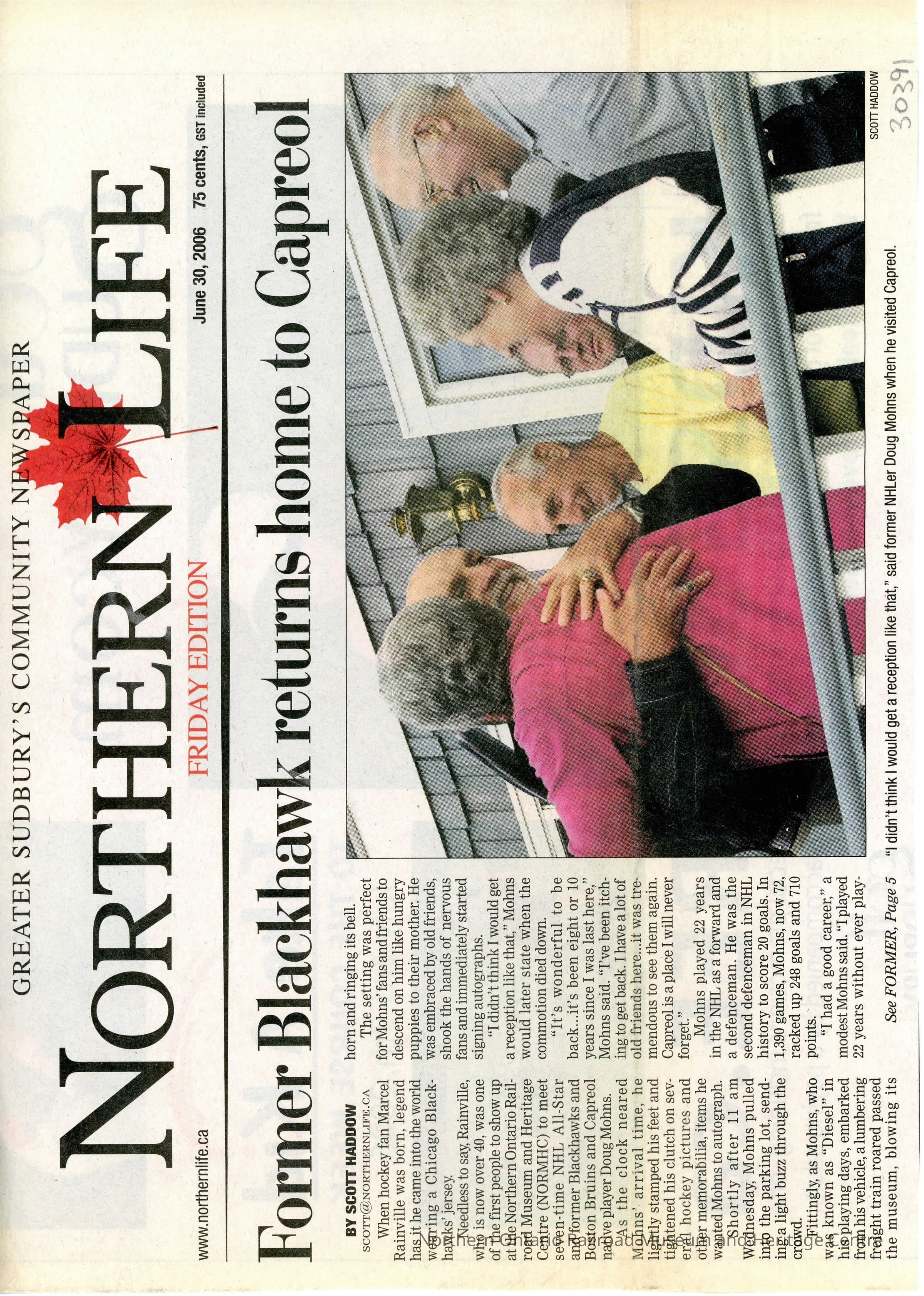 "Former Blackhawk returns Home to Capreol" in Northern Life, from Friday Edition on June 30, 2006. Features Doug Mohns in front of NORMHCCollection