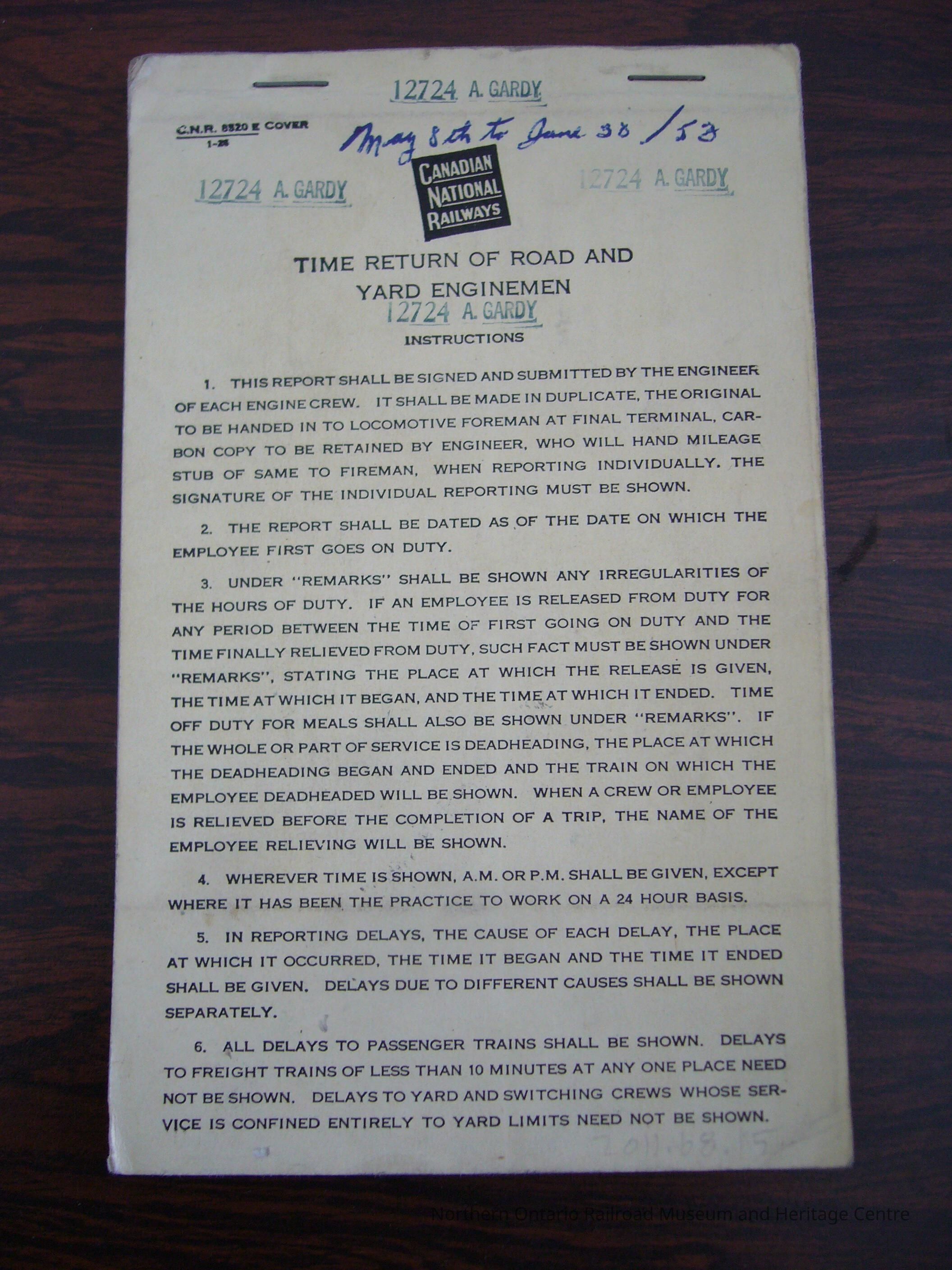 Canadian National Railways Time Return of Road and Yard Enginemen, 12724 A. GardyEntry/Object ID