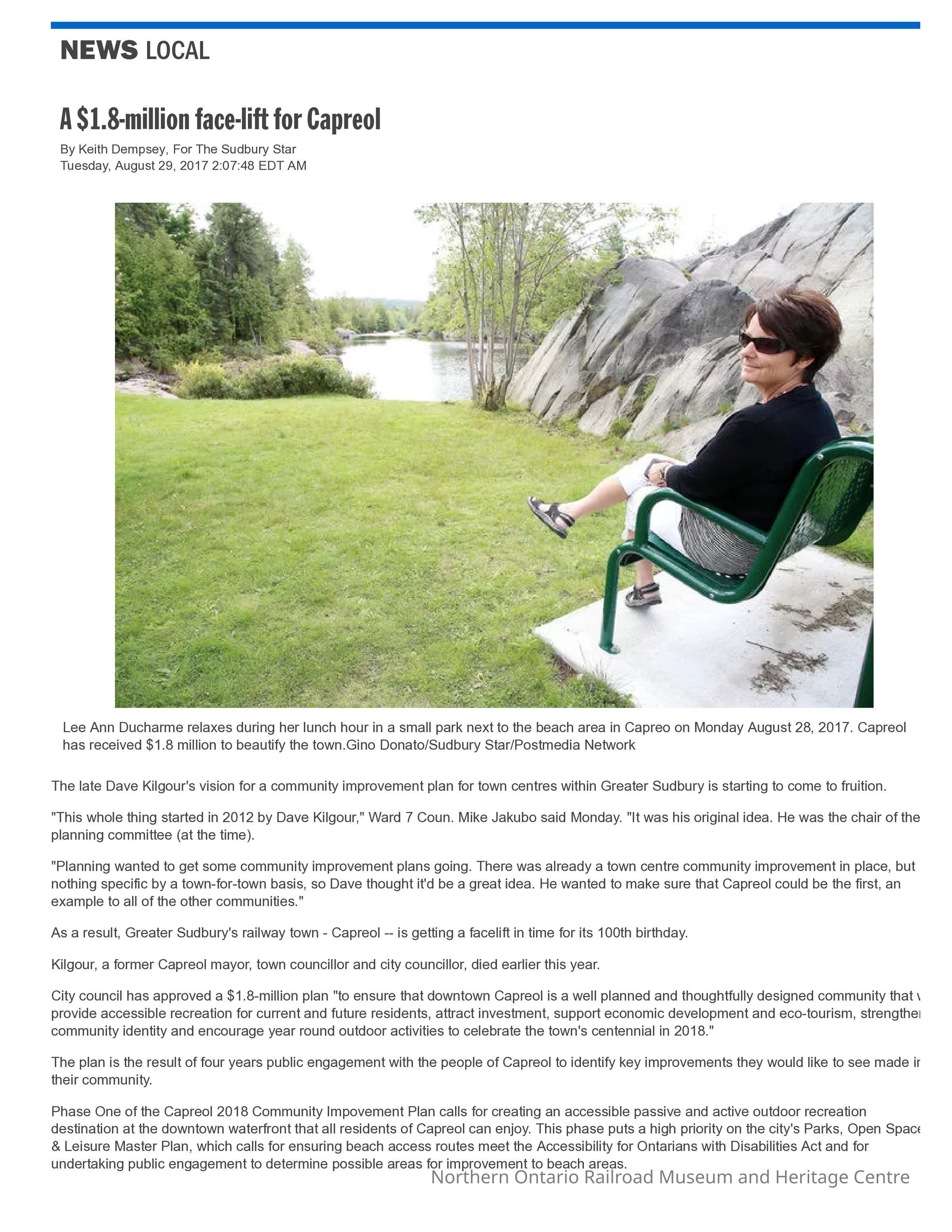 "A $1.8-million face-lift for Capreol" by Keith Dempsey on Sudburystar.ca, Tuesday, August 29, 2017. Details the CIP contribution to the Cpreol Waterfront as well as further infrastructure improvements to be made over the next year.Collection
