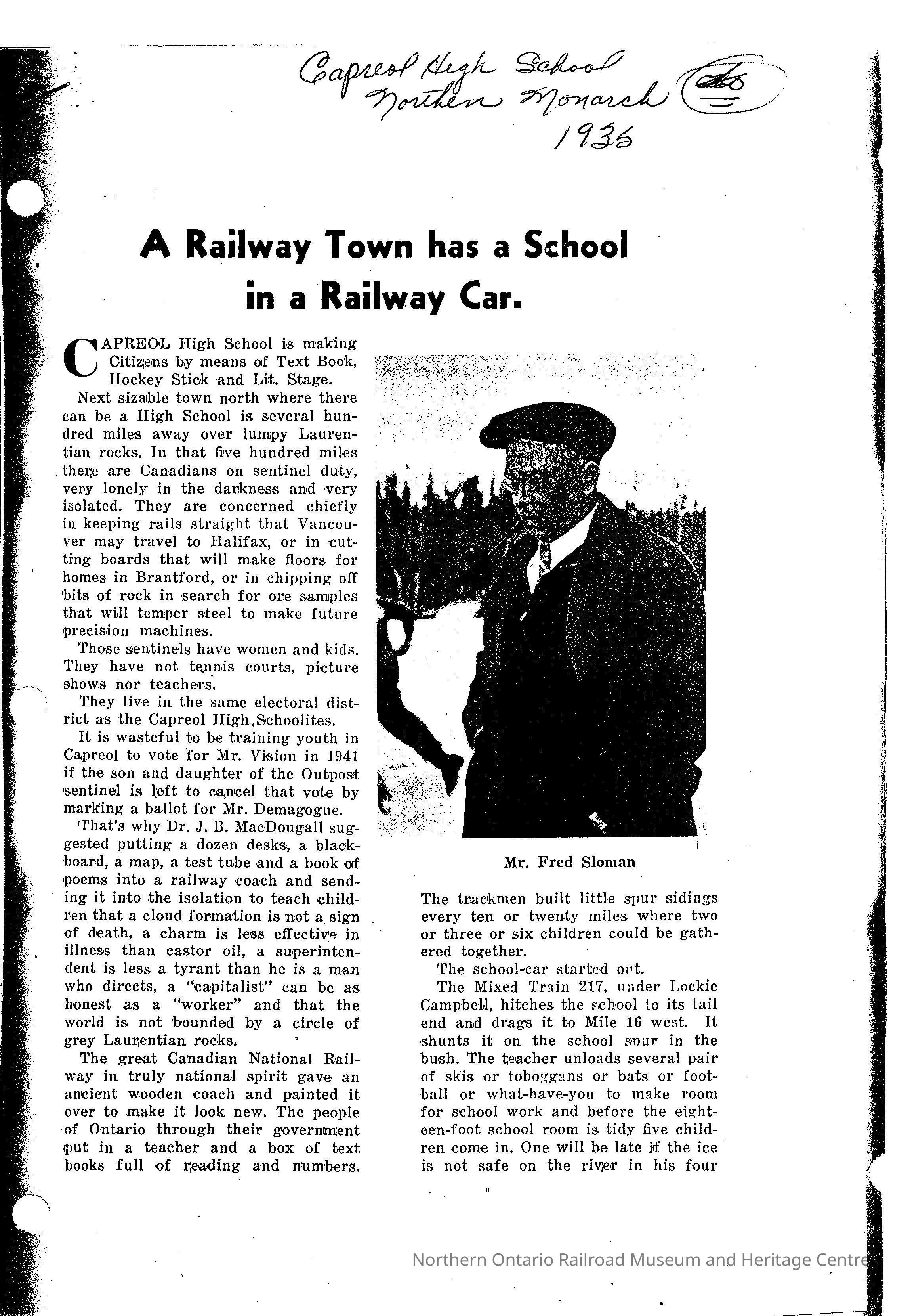 Discusses the implementation of school cars in Northern Ontario, specifically Capreol. Fred Sloman was the teacher on the school car that ran from Capreol to Foleyet from 1926 until 1962. School cars were commissioned by the government of Ontario to provide education to rural Northern Ontario communities.Collection