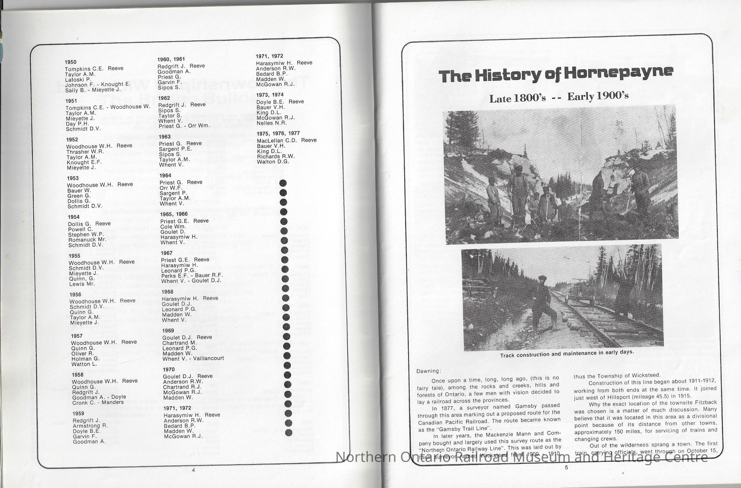 The book provides an illustrated history of Hornepayne between 1928 and 1978, composed and co-ordinated by Joyce Easton, Kathleen King and Janice Collins for the 50th Anniversary of incorporation of the Town of Hornepayne.