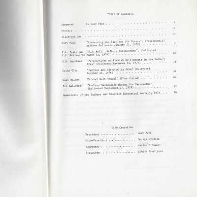 Book published by the Sudbury and District Historical Society compiling seven total papers/essays written on Sudbury History.Context