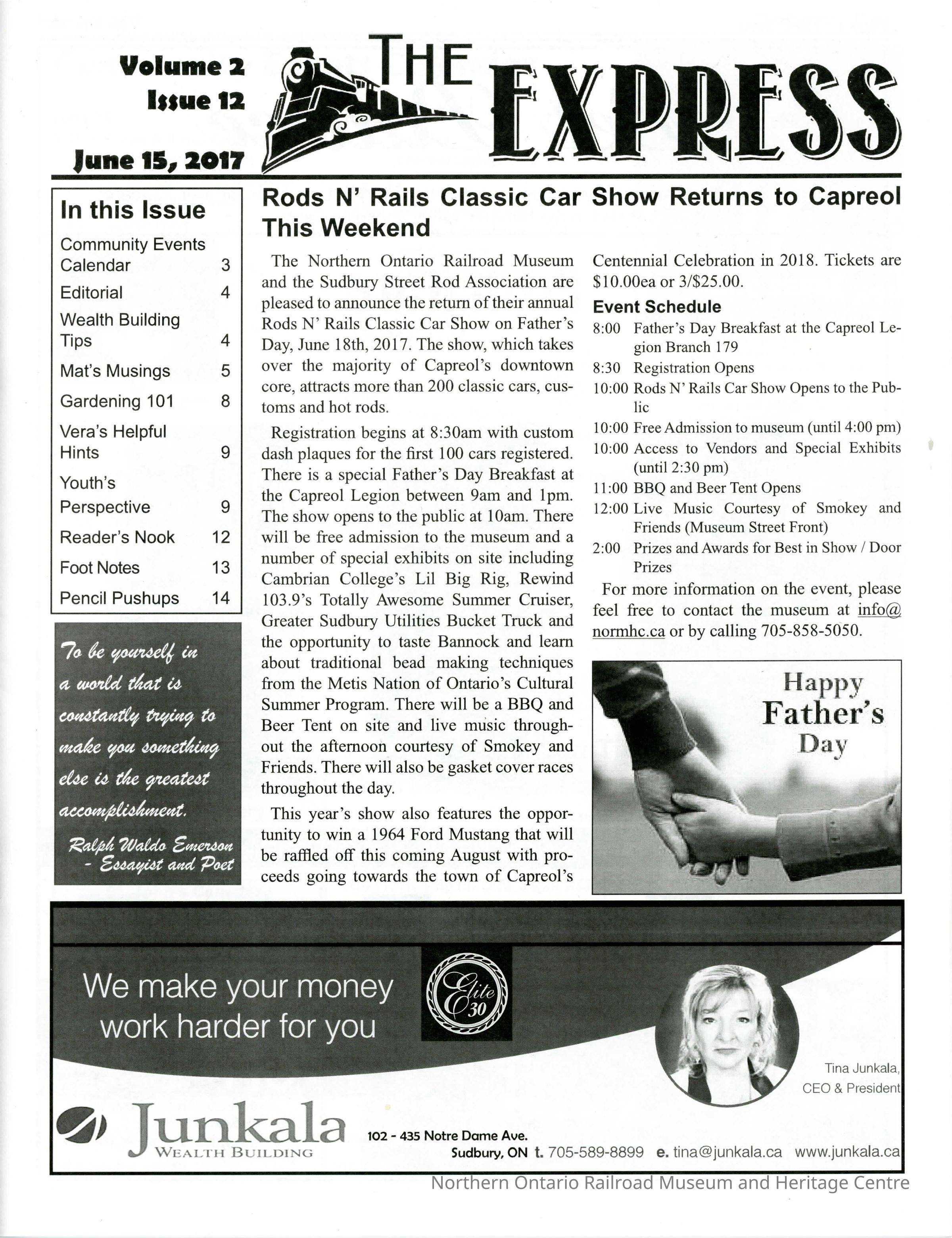 "Rods N' Rails Classic Car Show Returns to Capreol This Weekend" Front cover story in The Express, June 15 2017 Issue. Contains info about the event, as well as sponsors and previous years highlights.Collection