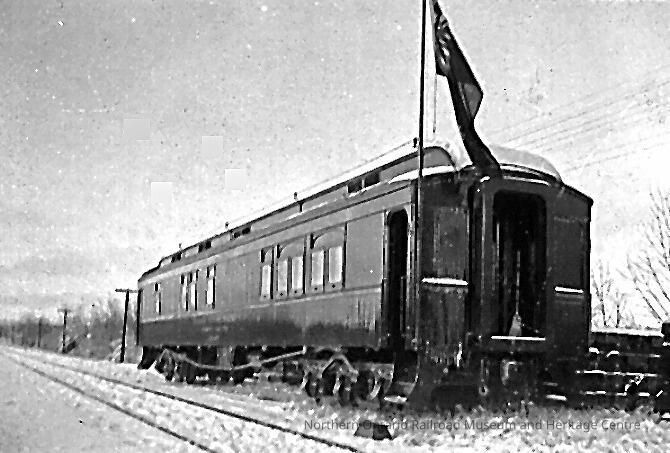 Photograph of Canadian National School Car No. 4 in 1936. This was the McKay's first school car. It is a wide angle shot from one side of the car, attempting to get the whole car in the shot. There is also a Union Jack visible, flying off the back end of the car.