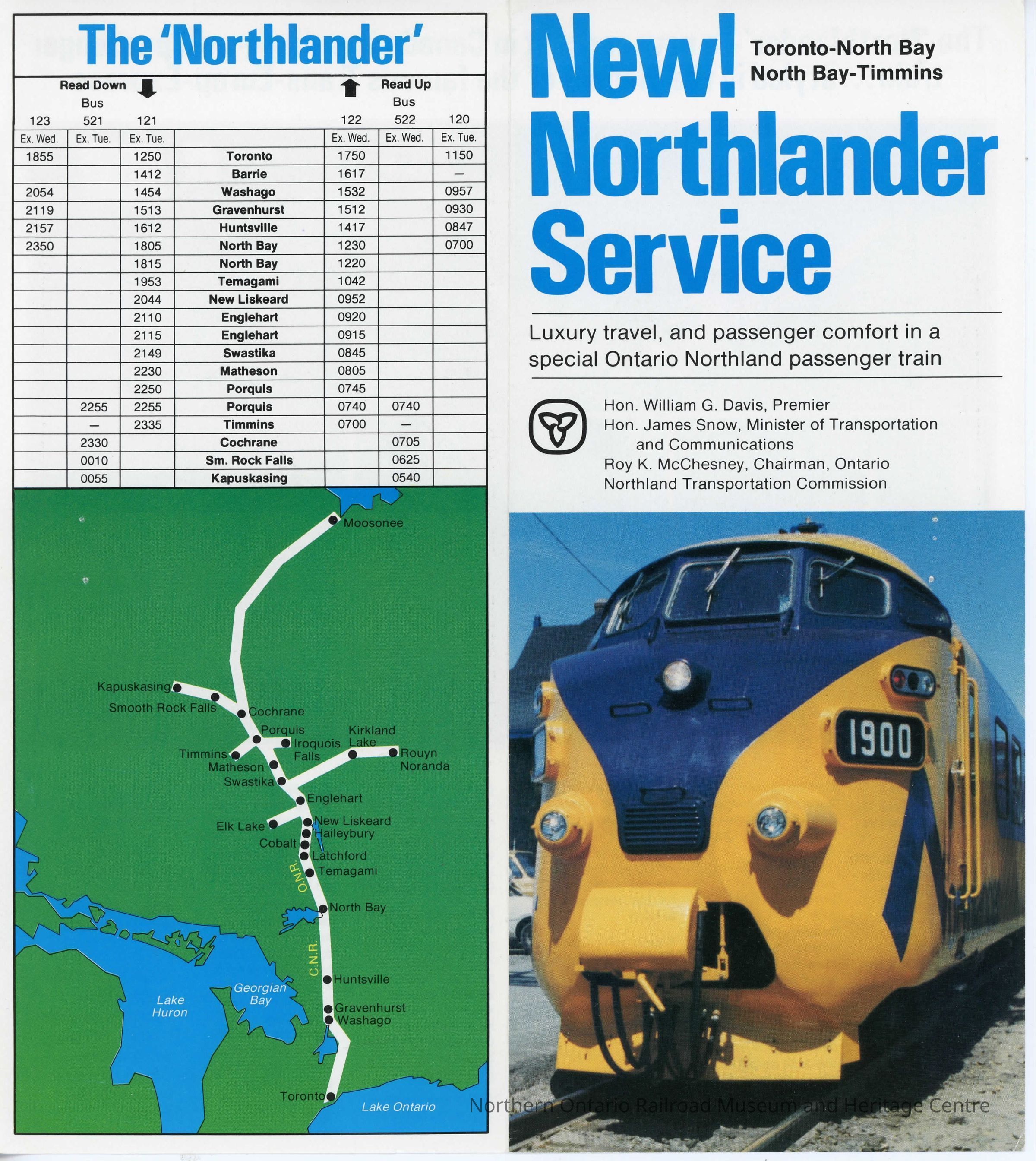 Two "New! Northlander Service" Promo Pamphlets. Features promotion of features as well as schedules and map of service This specific brochure detailed the services from Toronto to North Bay and North Bay to TimminsContext