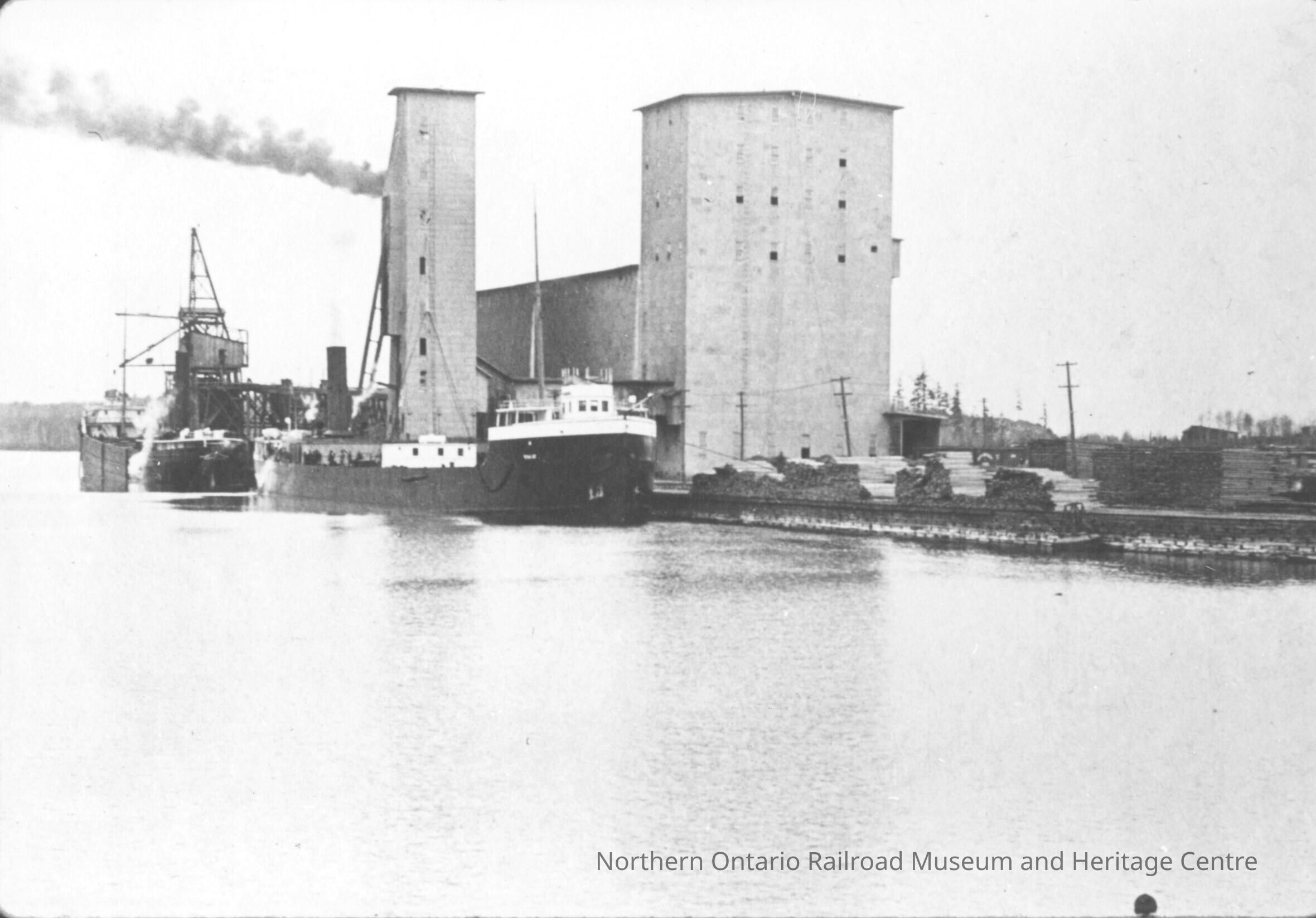 Black and white photograph of Depot Harbour. The photograph was taken from land and shows the Grand Trunk grain elevators and warehouse. There is a steam ship docked at the warehouse and it assumed to be having cargo loaded into it. On the dock there are large piles of logs waiting to be loaded onto the ship.