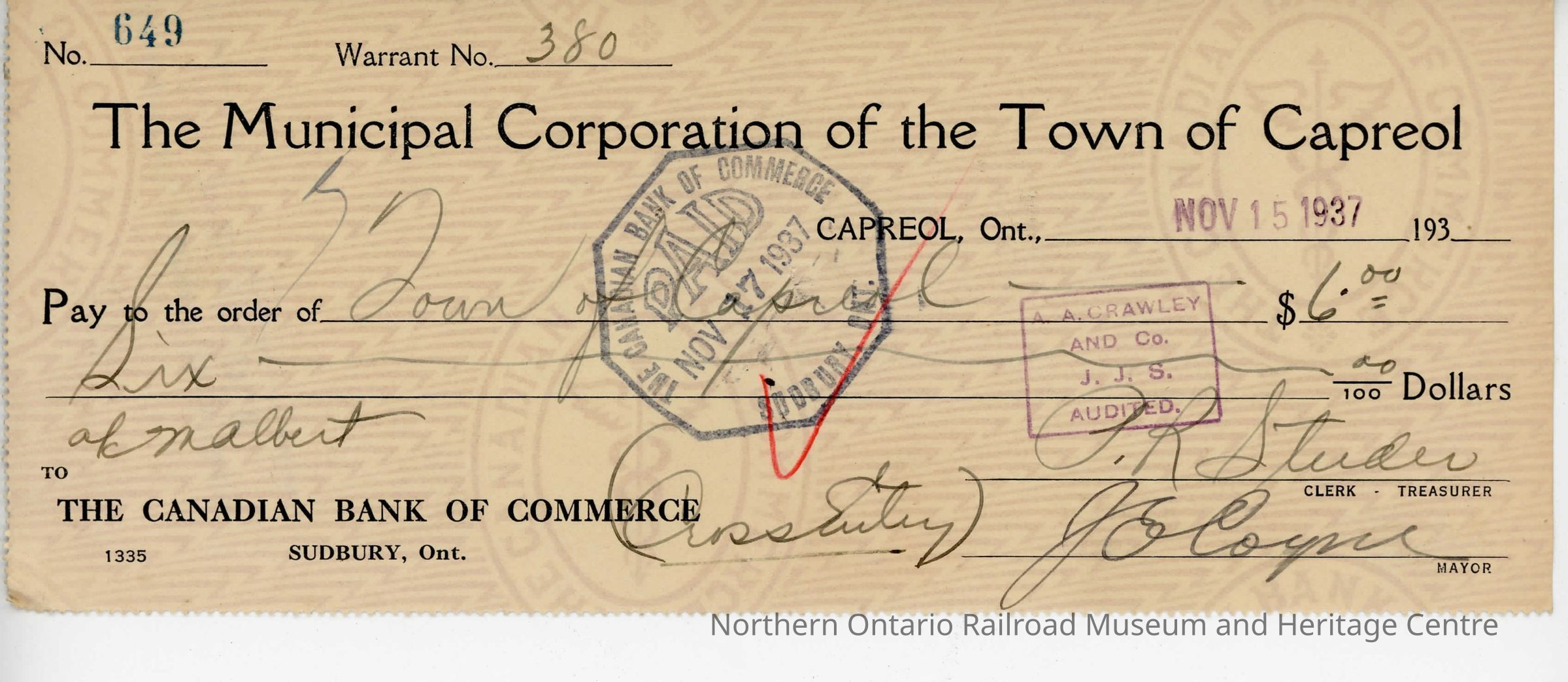 Original document, original cheque written on to the town of Capreol in 1937 for the amount of $6.00. Signed by Mayor Jim Coyne.Collection
