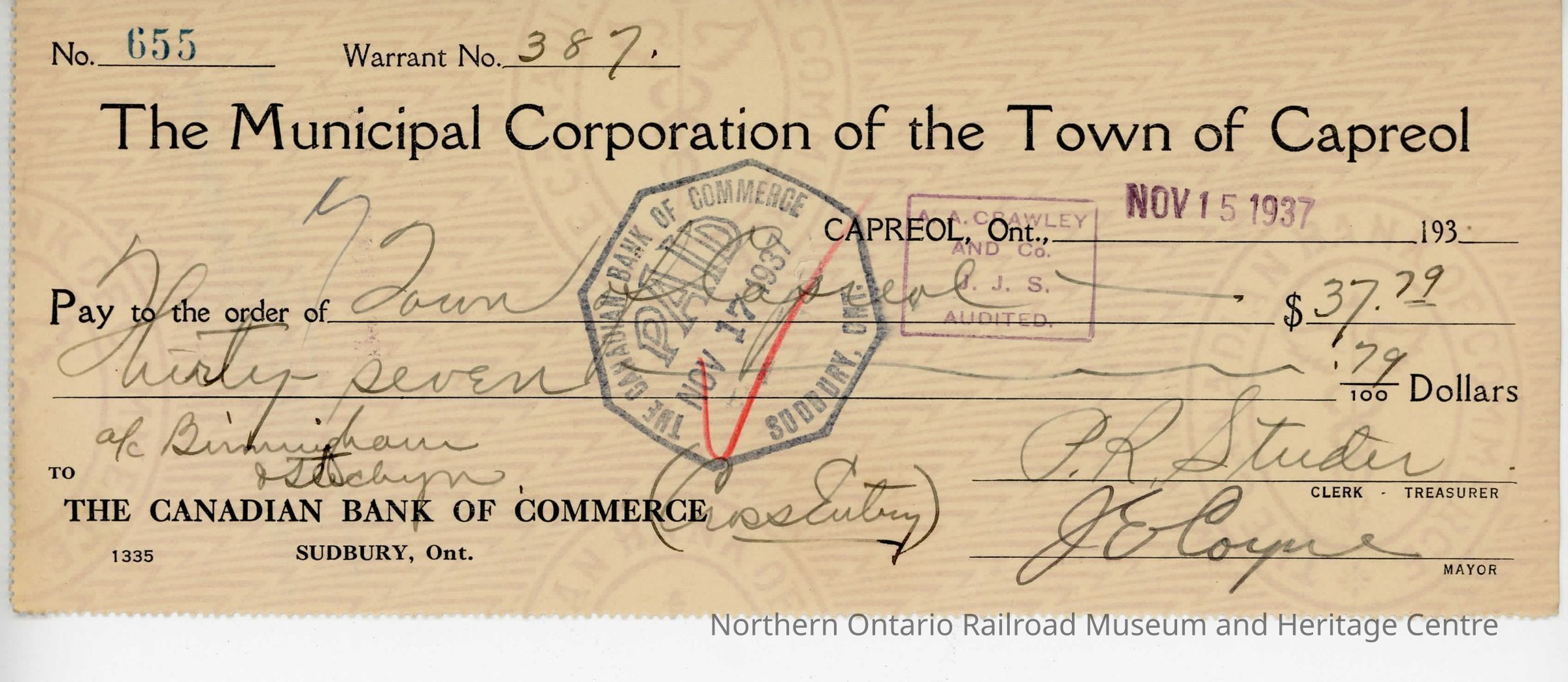 Cheque Written to the Municipal Corporation of the Town of Capreol, 1937 of BirminghamEntry/Object ID