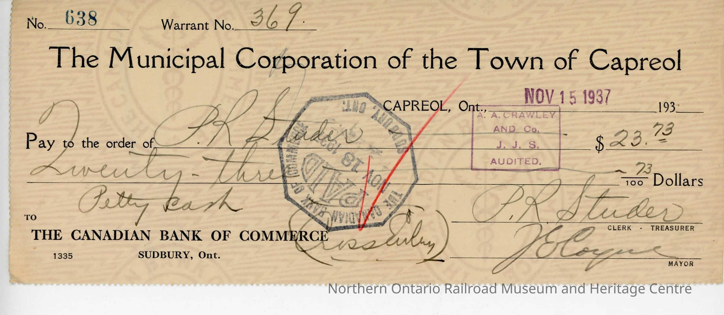 Cheque written and signed by mayor Jim Coyne on behalf of the Municipal Corporation of the Town of Capreol. The cheque was written on November 15th, 1937 and it was paid to P. R. Studer for the amount of $23.73.