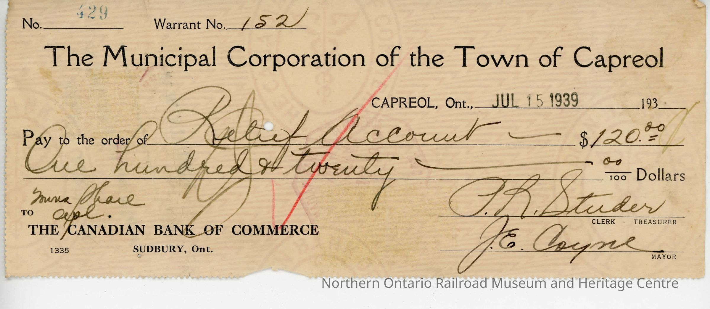 Original document, original cheque written on to the town of Capreol in 1939 for the amount of $120.00. Signed by Mayor Jim Coyne.Collection