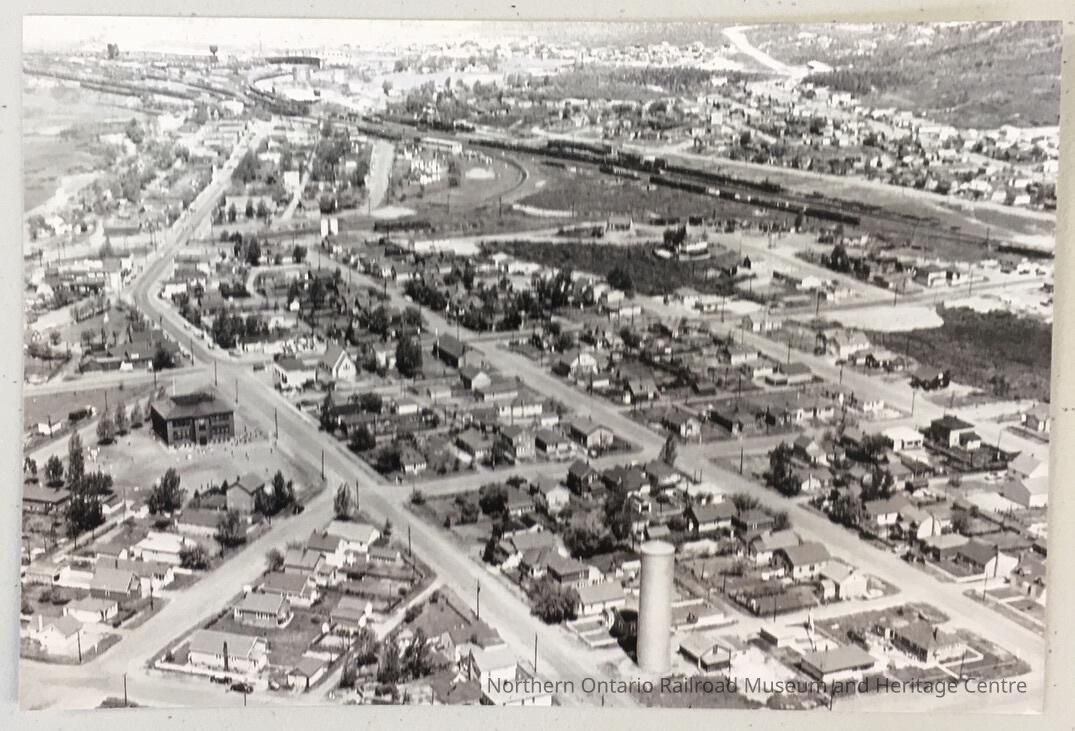 Copy of an aerial photograph of Capreol townsite. bland and white