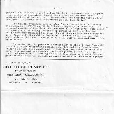 The article includes a summary of reports from the 1901 Ontario Bureau of Mines Report, "Gold in Placer Deposits", referring to the works of Robert H. Ahn and Walter Manly. 9 pages in total, type written with black ink on legal sized white paper. Page 7 is missingCollection