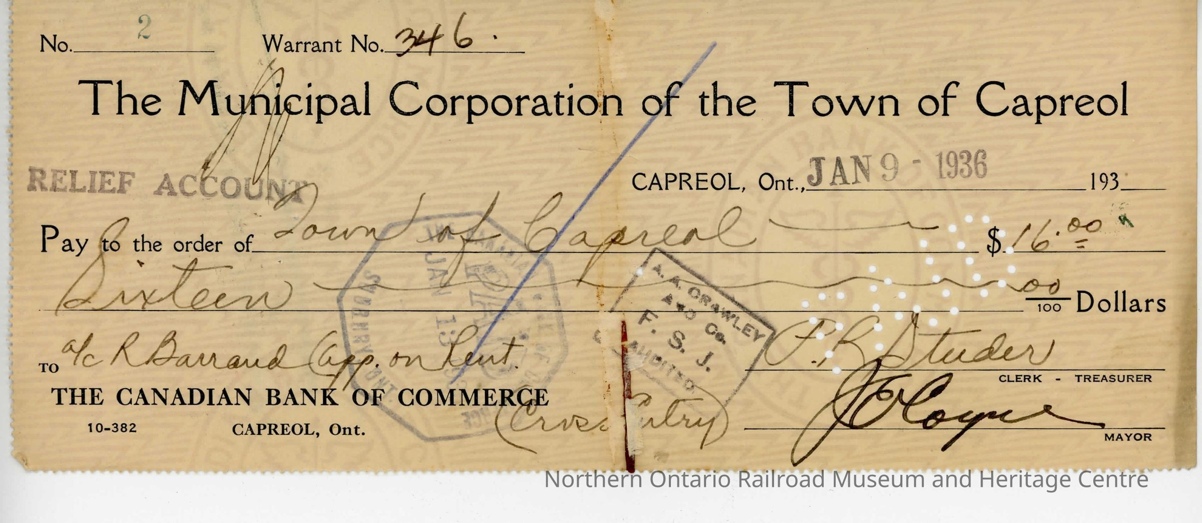 Original document, original cheque written on to the town of Capreol in 1936 for the amount of $16.00. Signed by Mayor Jim Coyne.Collection