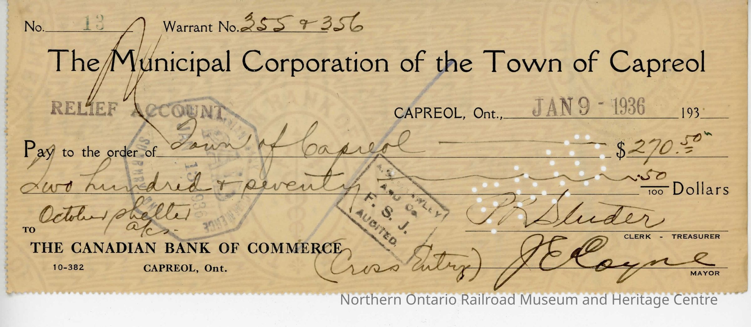 Original document, original cheque written on to the town of Capreol in 1936 for the amount of $270.50. Signed by Mayor Jim Coyne.Collection
