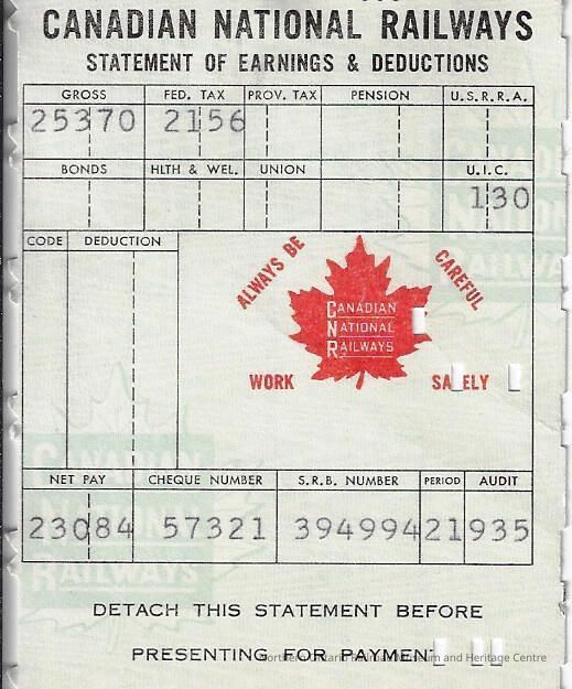 Canadian National branded statement of earnings and deductions belonging to Frank Mazzuca. The year is unknown, circa 1950sContext