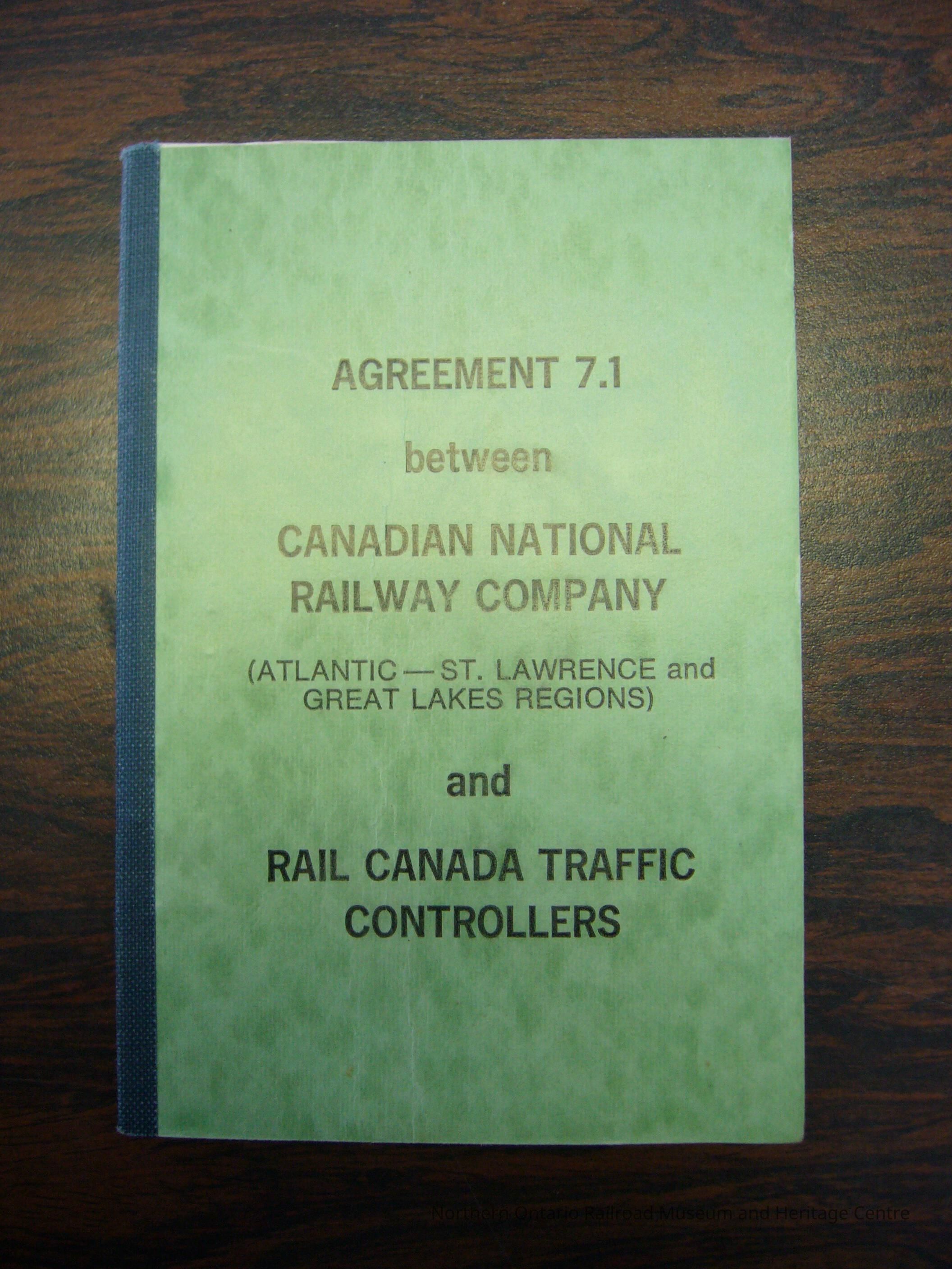 Agreement 7.1 Between Canadian National Railway Company (Atlantic - St. Lawrence and Great Lakes Regions) and Rail Canada Traffic Controllers, governing the employment and compensation of employees of the classifications specified. Revised and reprinted July 26, 1982.Collection