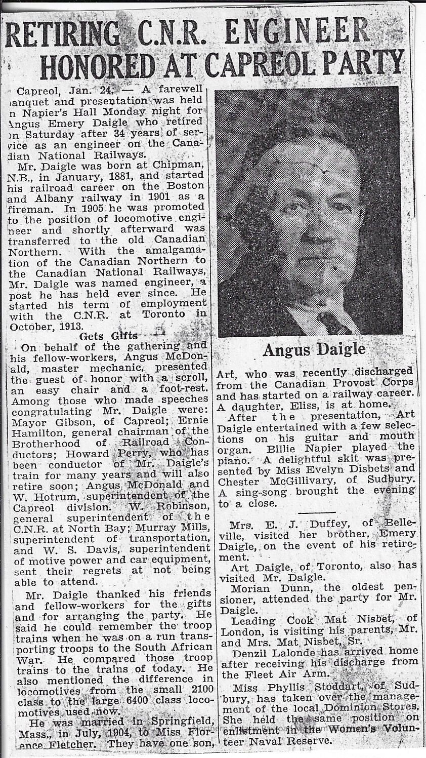 Newspaper clipping of an article discussing Angus Daigle's retirement from Canadian National.Context