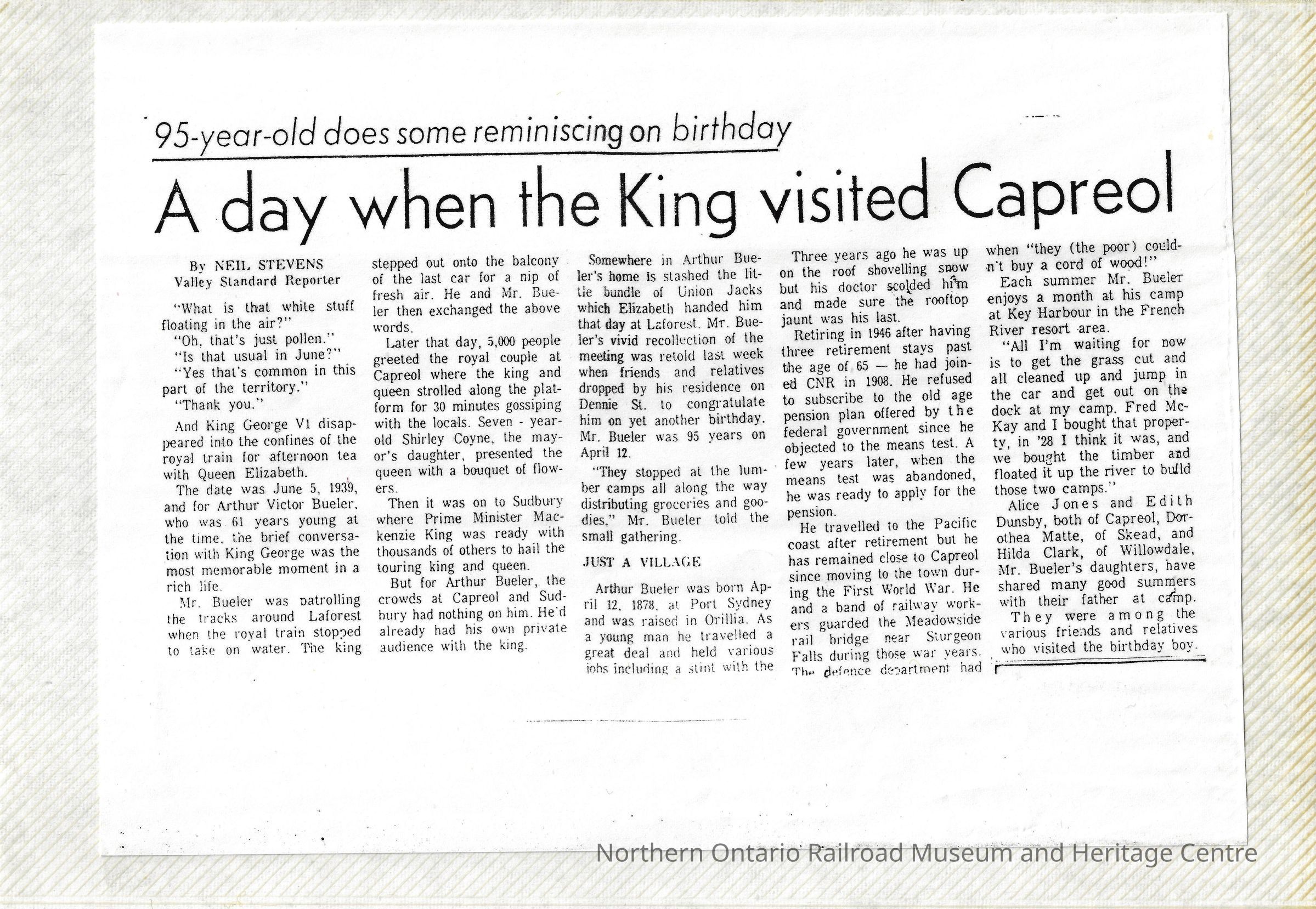 News clipping, "95-year-old does some reminiscing on birthday: A day when the King visited Capreol" by Neil Stevens. Describes Arthur Victor Bueler's memories of the Royal Visit on June 5, 1939 34 years previously and his brief conversation with King George VI. Published by the Valley Standard Reporter in 1973.Collection