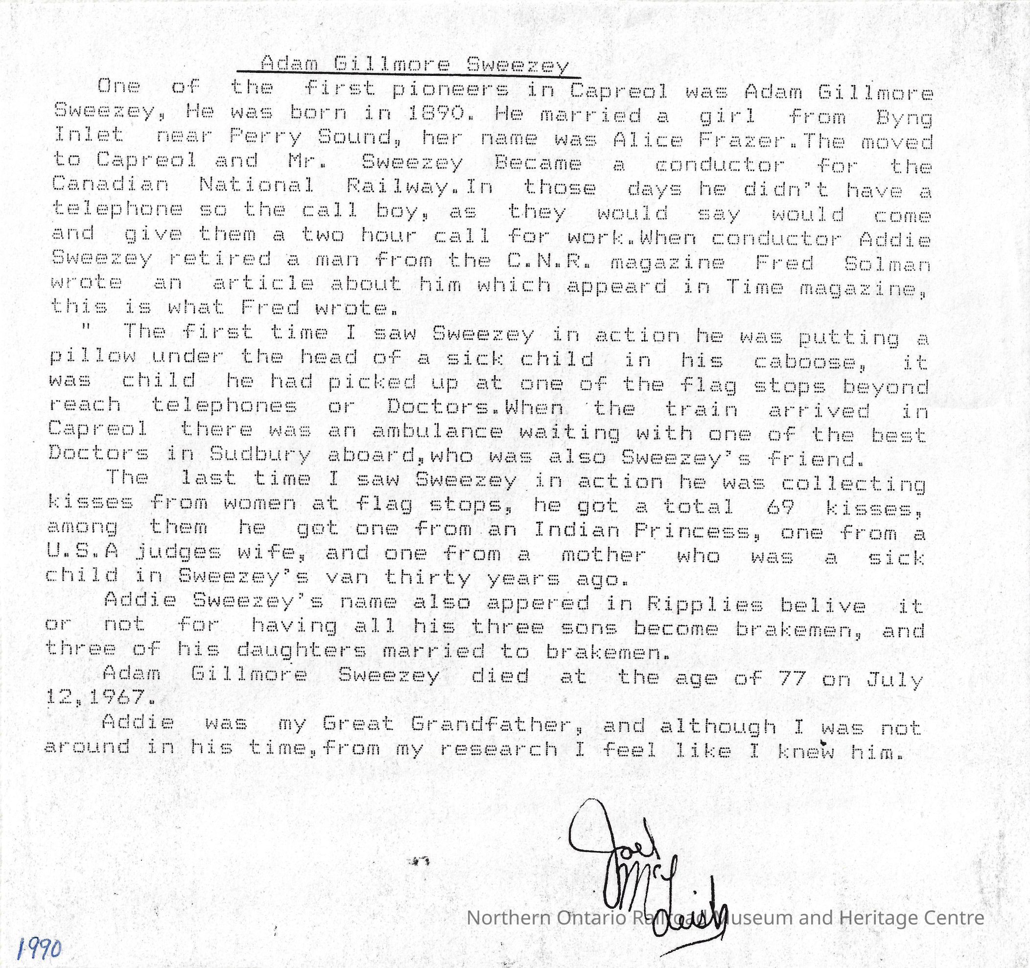 A short article, written by Joel McLeish and published in 1990, regarding the life of Adam 'Addie' Gillmore Sweezey ("King of the Mixed"), one of the first pioneers in Capreol and a conductor for the Canadian National Railway. (Also great grandfather of Joel McLeish).Collection