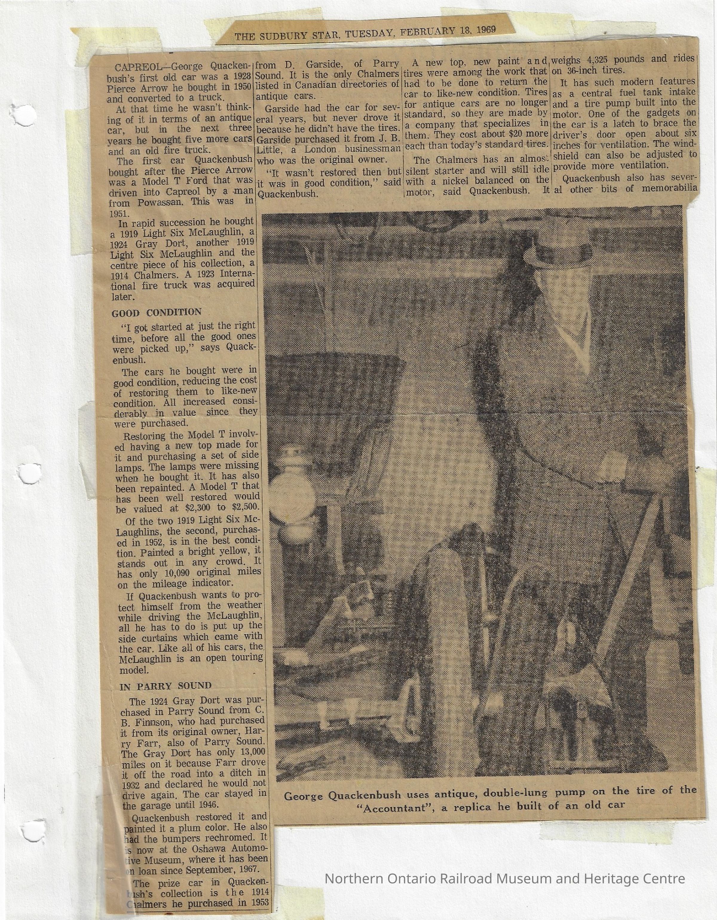 News clipping, Sudbury Star article on George Quackenbush and his antique car collection. Includes a black and white photograph of Quackenbush dressed in a tweed suit and a bowler cap, pumping the tine of the "Accountant" (a replica antique car he built) with an antique double lung pump. There are two sheets total, and on the second there is another black and white photograph of 55 year old George Quackenbush sitting at the wheel of his 1914 Chalmers.Collection