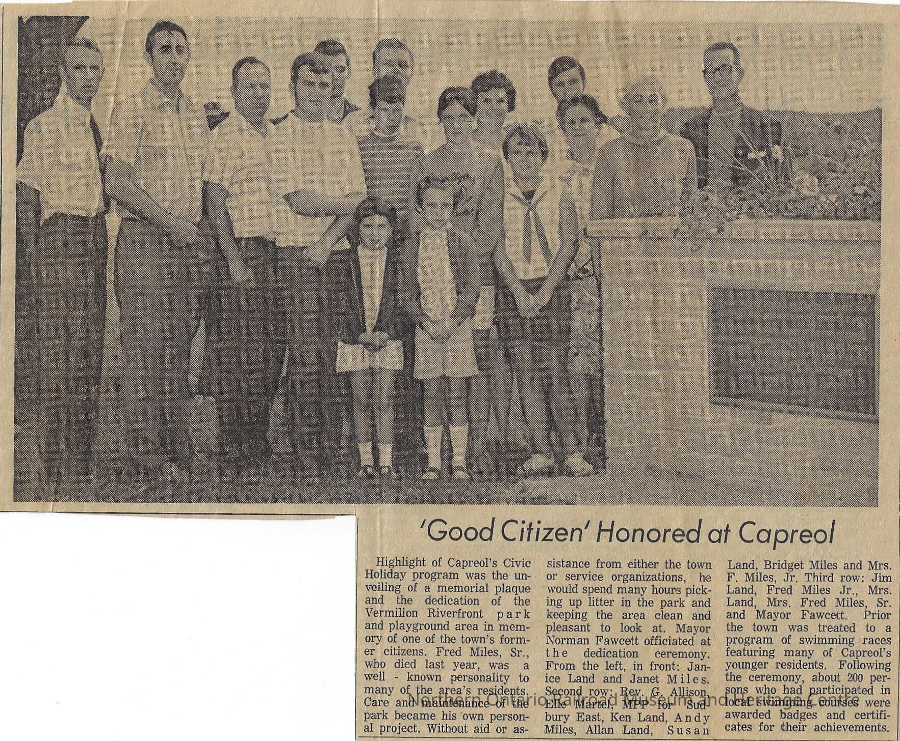 A short news article, "Good Citizen' Honored at Capreo." Describes the dedication ceremony of the Capreol River front Park in the memory of Mr. Frederick G. Miles. Includes a black and white photograph of individuals gathered around the erected plaque, from left to right, front row: Janice Land, Janet Miles. Second row: Reverend G. Allison, Elie Martel (MPP for Sudbury East), Ken Land Andy Miles, Allan LAnd,Susan Land, Bridget Miles and Mrs. F. Miles, Jr. Third row: Jim Land, Mrs. Fred Miles, Sr. and Mayor Norman Fawcett.Collection