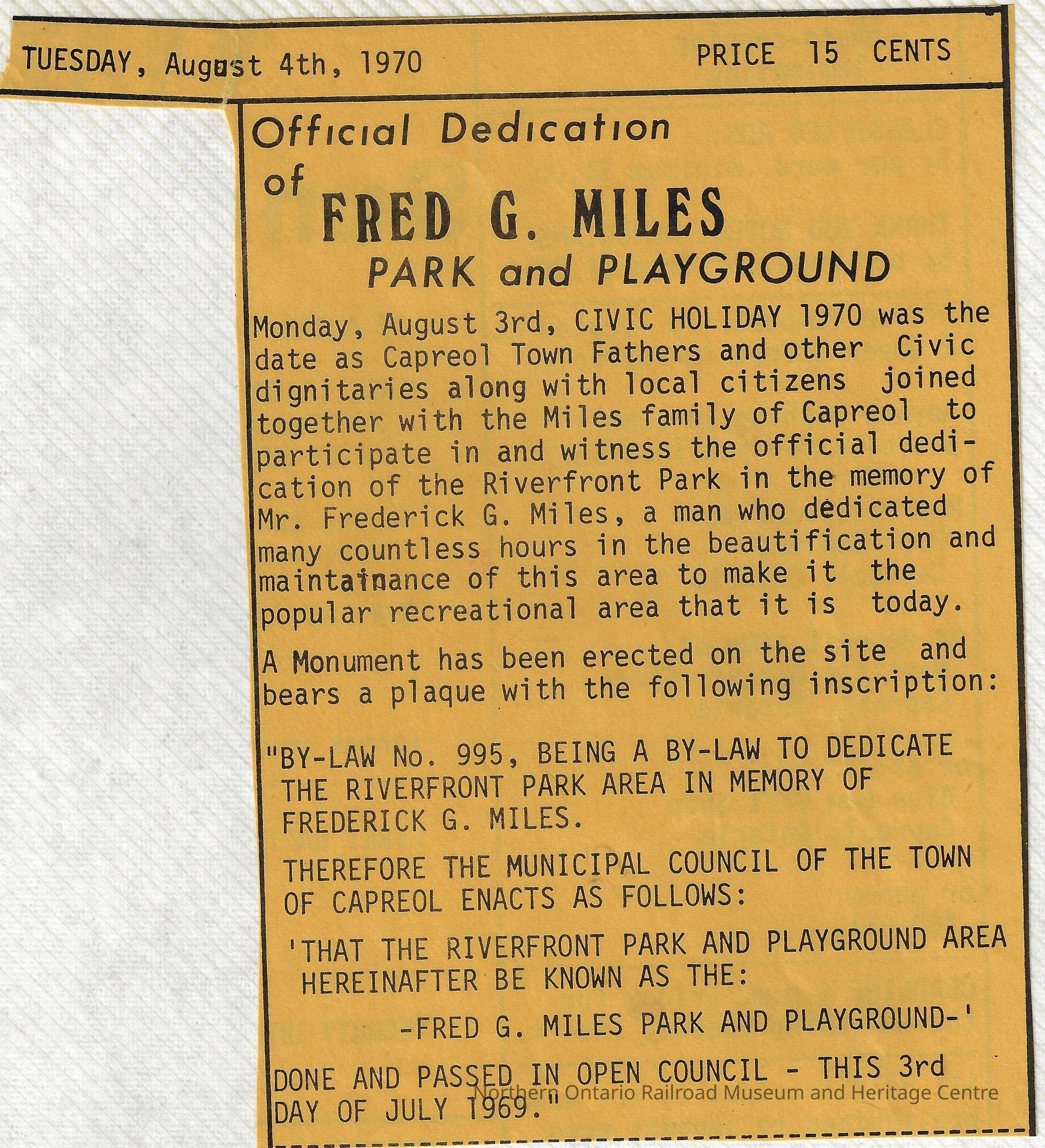A short news article, published Tuesday, August 4th 1970. "Official Dedication of Fred G. Miles Park and Playground." Describes the dedication of the Capreol River front Park in the memory of Mr. Frederick G. Miles and the erection of a plaque for the same.Context