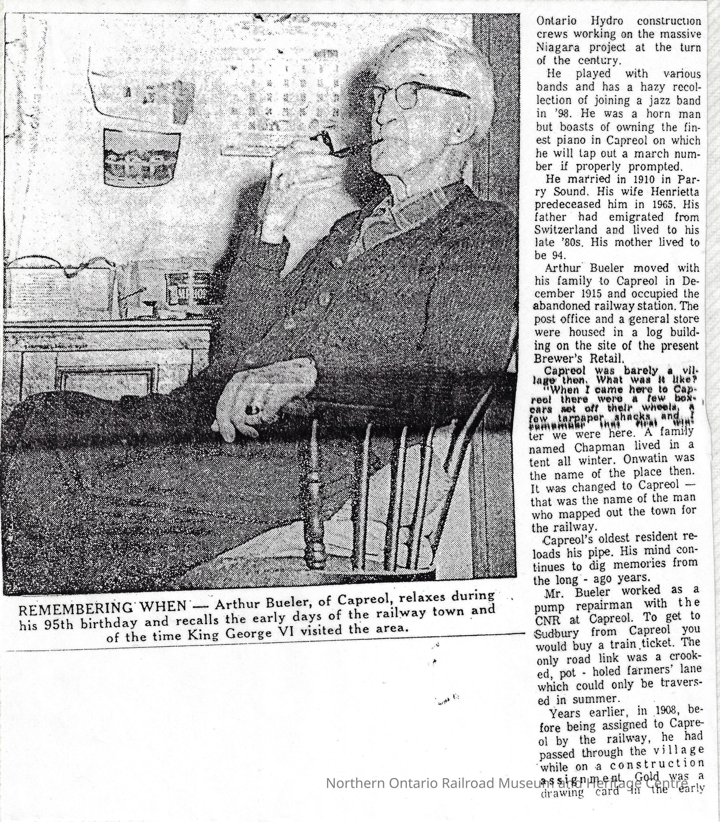 News clipping, "Remembering When -Arthur Bueler, of Capreol, relaxes during his birthday and recalls the early days of the railway town and the time King George VI visited the area". Includes a black and white photograph of Arthur Bueler, sitting in a wooden dinning chair in his kitchen with a tobacco pipe resting in his right hand.Collection
