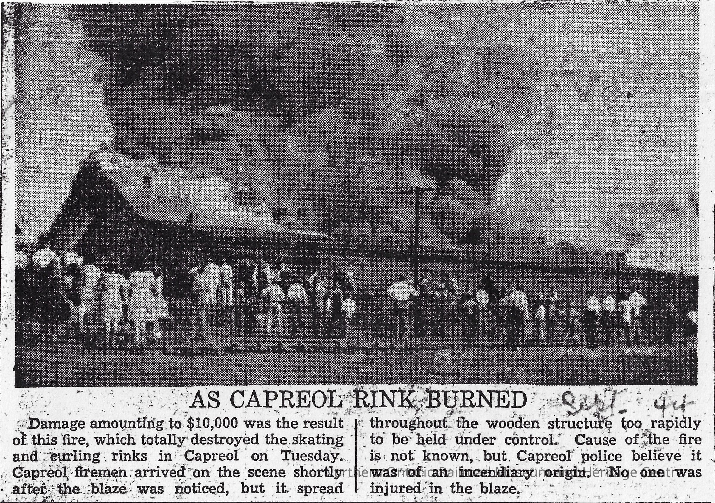 A short news clipping regarding the Capreol arena fire, September 1944. Includes a black and white photograph of the blaze, with a number of residents lined up watching the arena burn.
