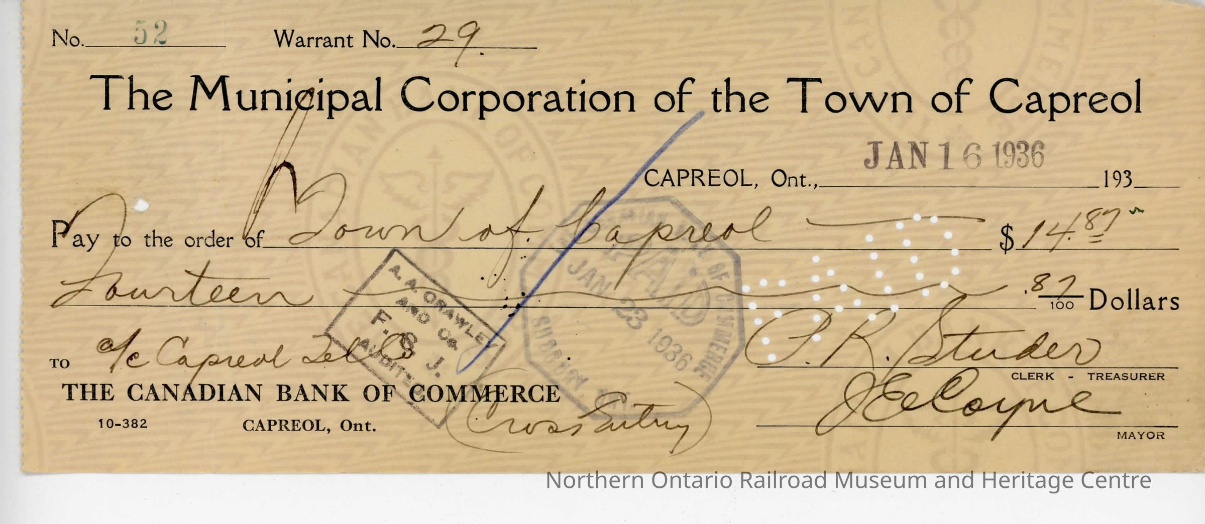Cheque written to and signed by mayor Jim Coyne on behalf of the Municipal Corporation of the Town of Capreol. The cheque was written on January 16th, 1936 for the amount of $14.87 to be paid by Capreol Telephone Company.
