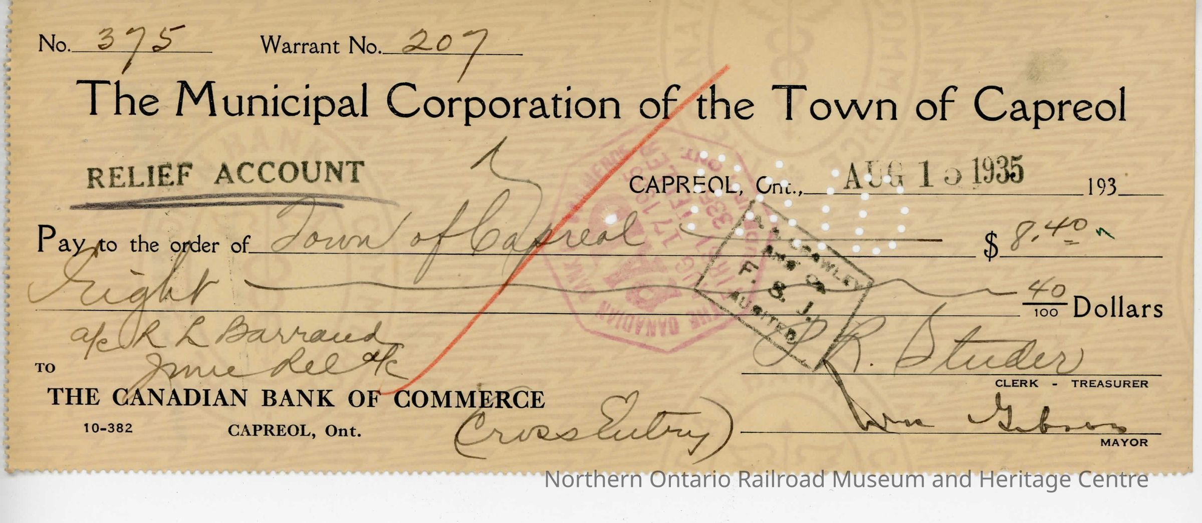 Cheque written to and signed by mayor William Gibson on behalf of the Municipal Corporation of the Town of Capreol. The cheque was written on August 15th, 1935 for the amount of $8.40 to be paid by R. R. Barraud.
