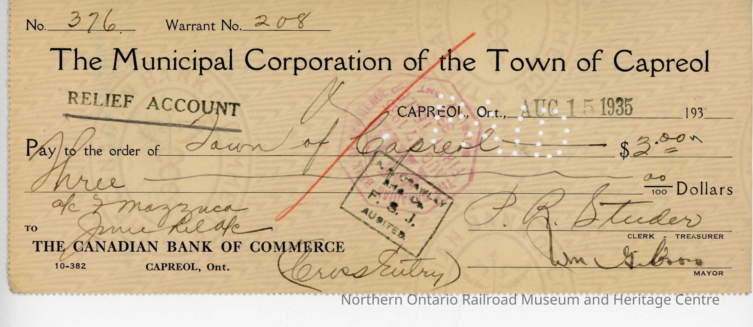 Cheque written to and signed by mayor William Gibson on behalf of the Municipal Corporation of the Town of Capreol. The cheque was written on August 15th, 1935 for the amount of $3.00 to be paid by F. Mazzuca.
