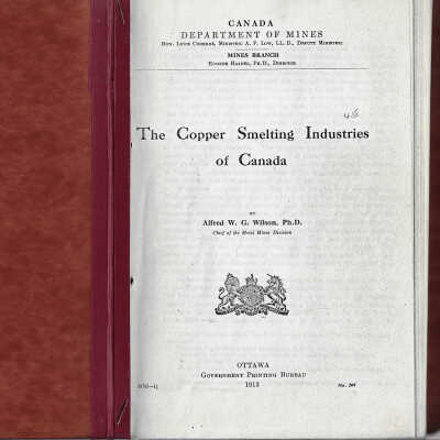 Book, report discussing the state of the Copper Smelting Industries of Canada as of 1913.Context