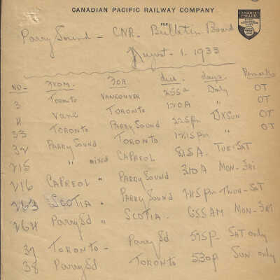 Set of 14 total notes regarding Canadian National's passenger runs specifically through Parry SoundContext