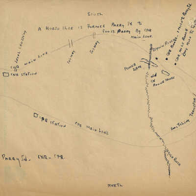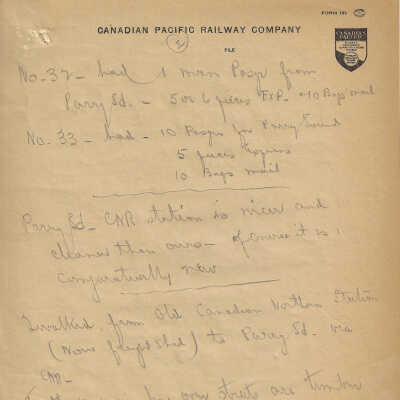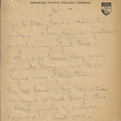 The notes are written on Canadian Pacific letterhead, and are regarding the popularity of their passenger service in comparison to Canadian National's. This includes a comparison of schedule, a copy of what was written on the Canadian National Station's bulletin board in Parry Sound, the number of passengers getting on and off, overall experience, types of cars, and a map of the route.