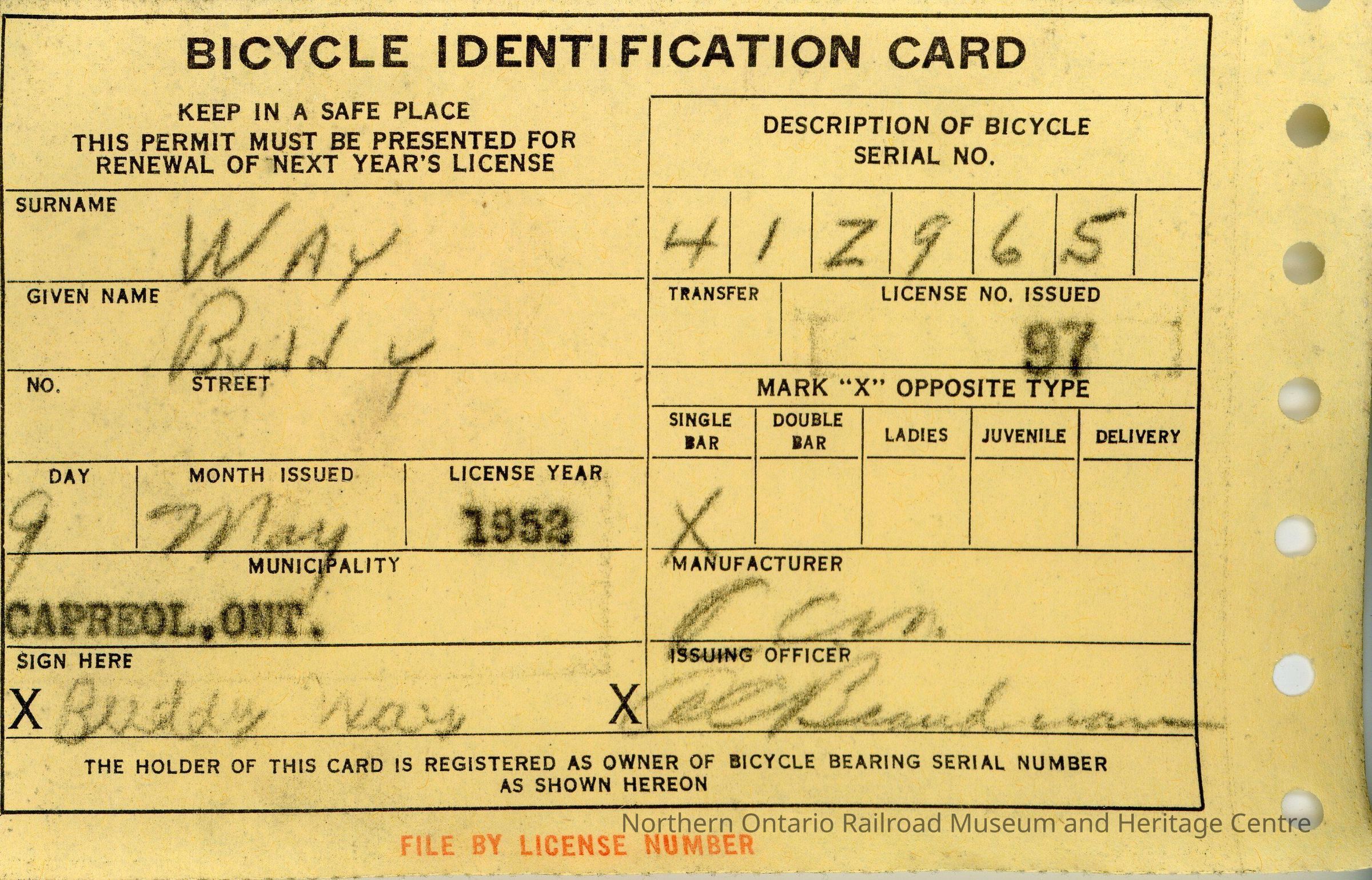 Bicycle Identification Card, Buddy Way, May 9th, 1952.Collection