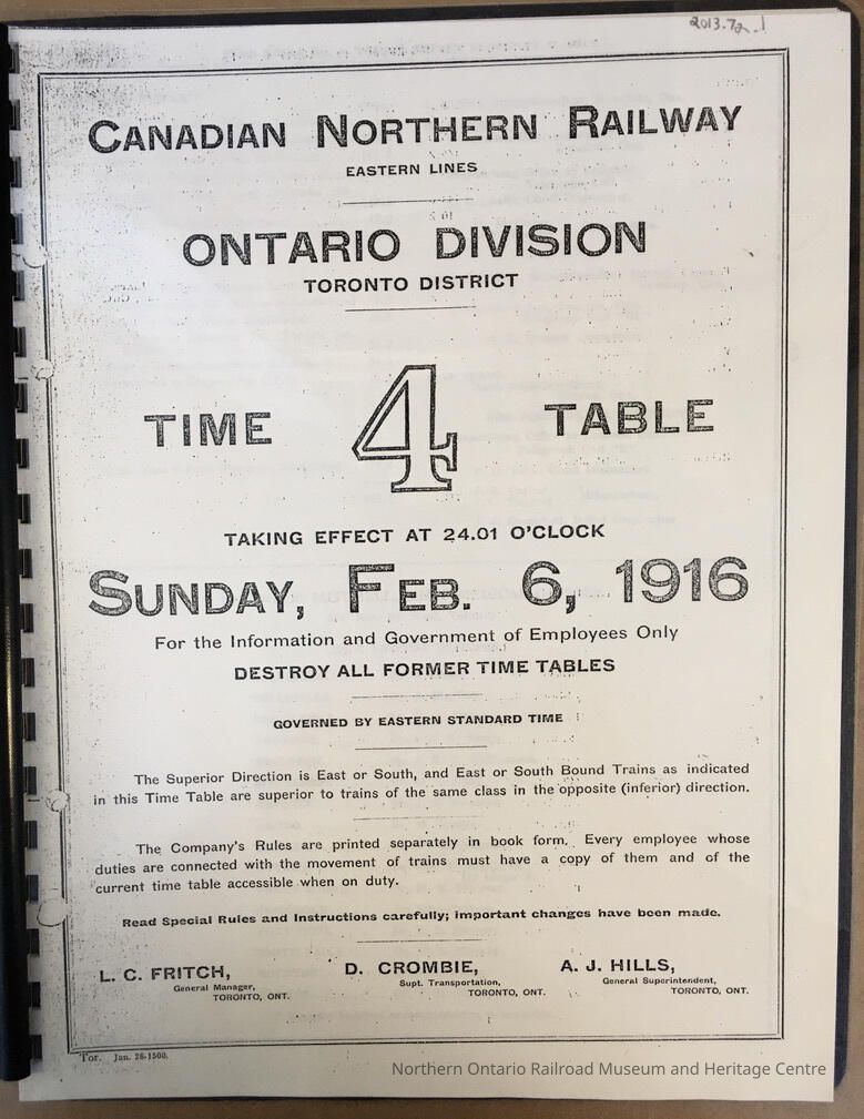 Binder: Canadian Northern Railway, Eastern Lines, Ontario Division, Toronto District, Time table 4, 1916Description